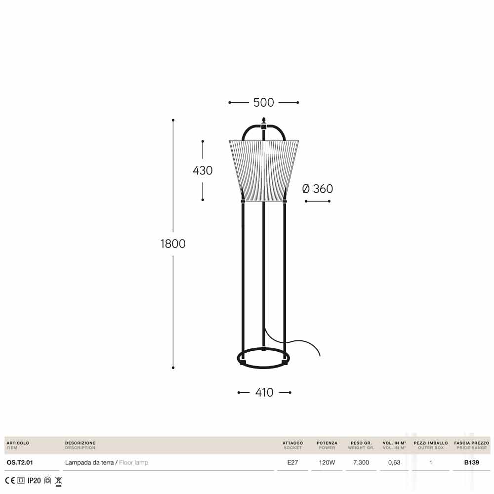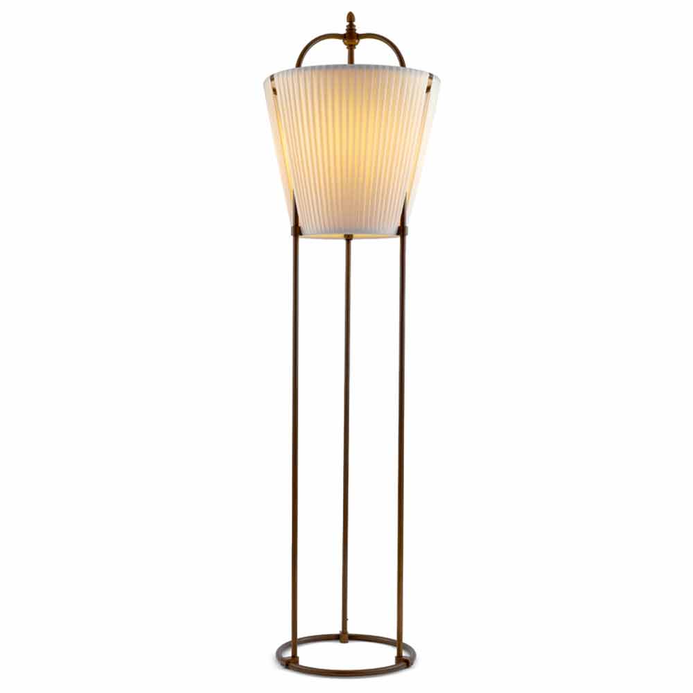 Tenarunga, apparecchio mobile da terra su base tonda, con struttura in ottone anticato a tre montanti, ad una sorgente luminosa, con schermo in tessuto interamente integrato alla struttura.