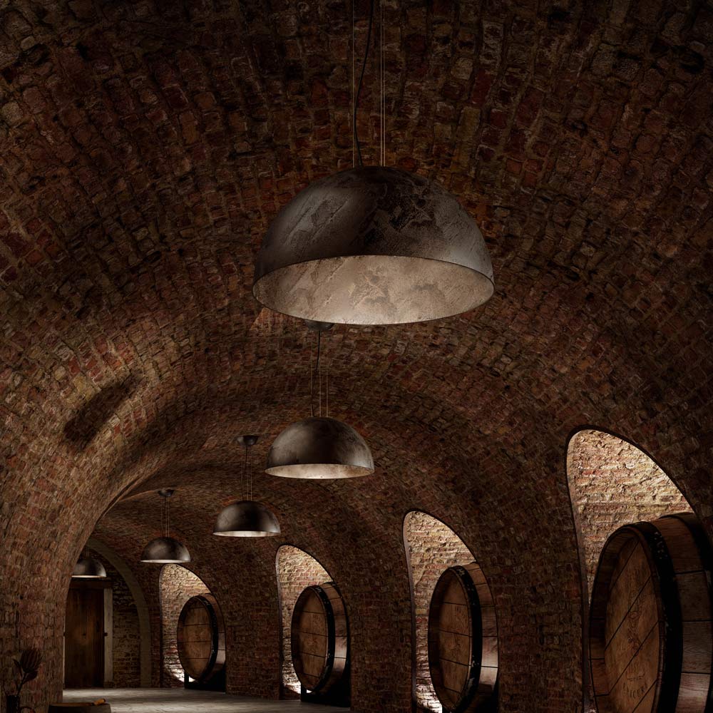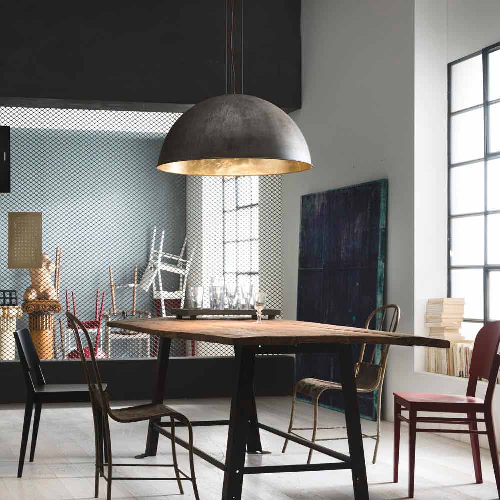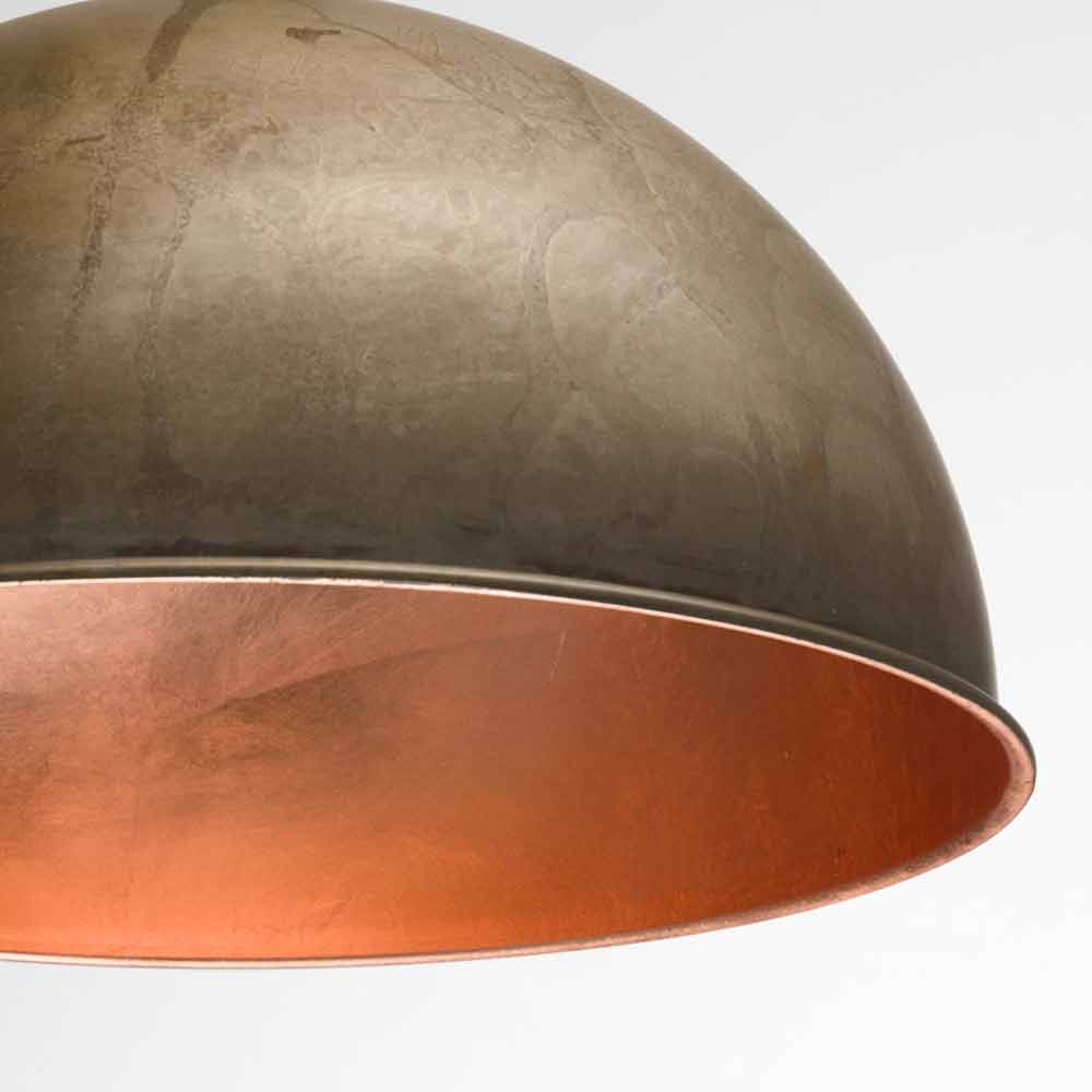 Il tratto grafico deciso e la perfetta mezza sfera caratterizzano questa collezione di lampade, che si configura come un omaggio alla rivoluzione astronomica. Il contrasto tra l'esterno in ottone o ferro e l'interno realizzato in foglia oro, foglia argento o rame, conferisce a questo prodotto un valore estetico di grande effetto visivo. Disponibile con esterno in ottone o ferro nei diametri 30,40,60 cm e con esterno in ferro nel diametro 80 cm.
