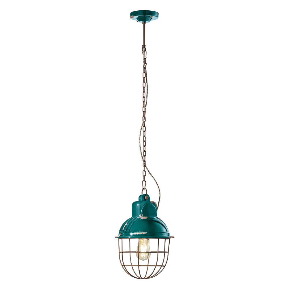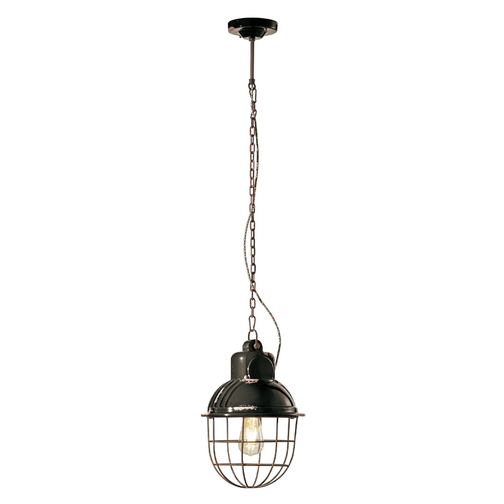 Lampada sospesa in ceramica e ferro con griglia, varie finiture industriali made in Italy by Ferroluce.