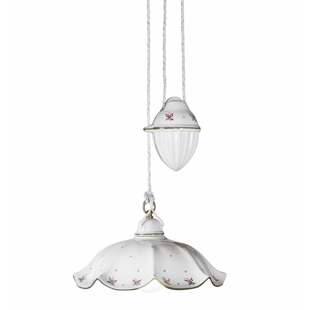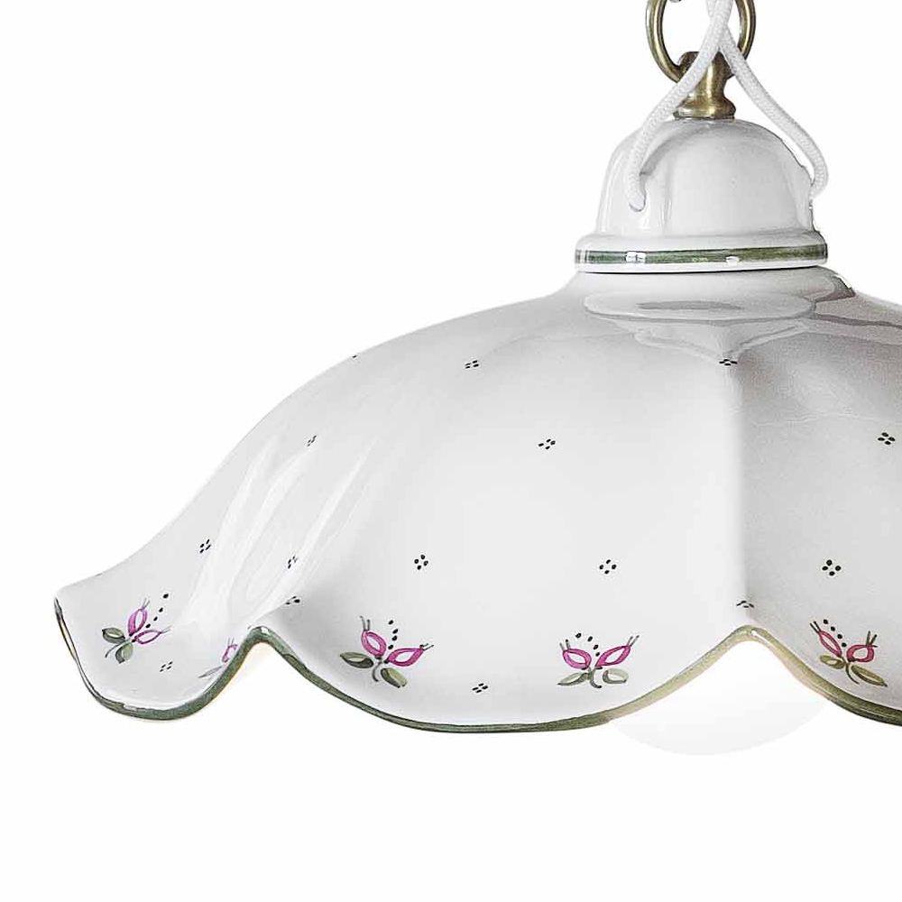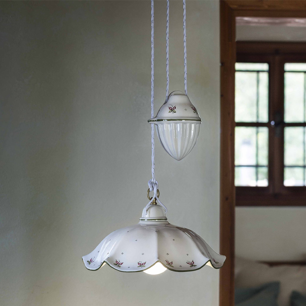 Lampada a sospensione saliscendi con ceramica ondulata dipinta a mano made in Italy by Ferroluce.