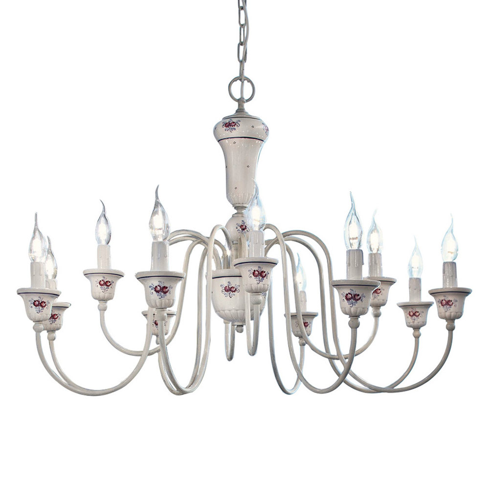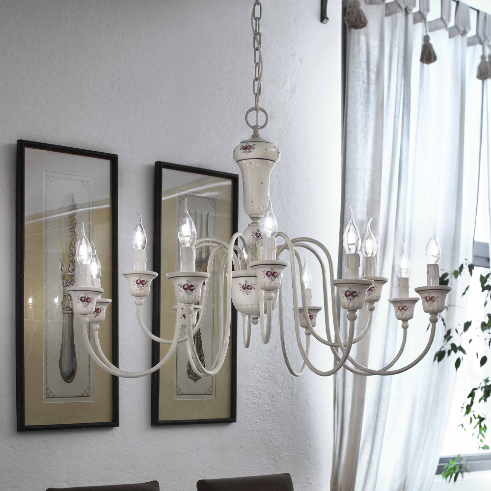 Questo lampadario a 12 luci è interamente realizzato artigianalmente in ottone verniciato e ceramica con decoro floreale dipinto a mano, a evidenziare la maestria e la manualità degli artigiani.
