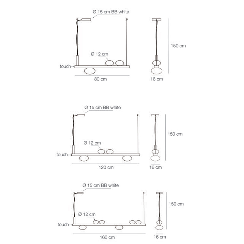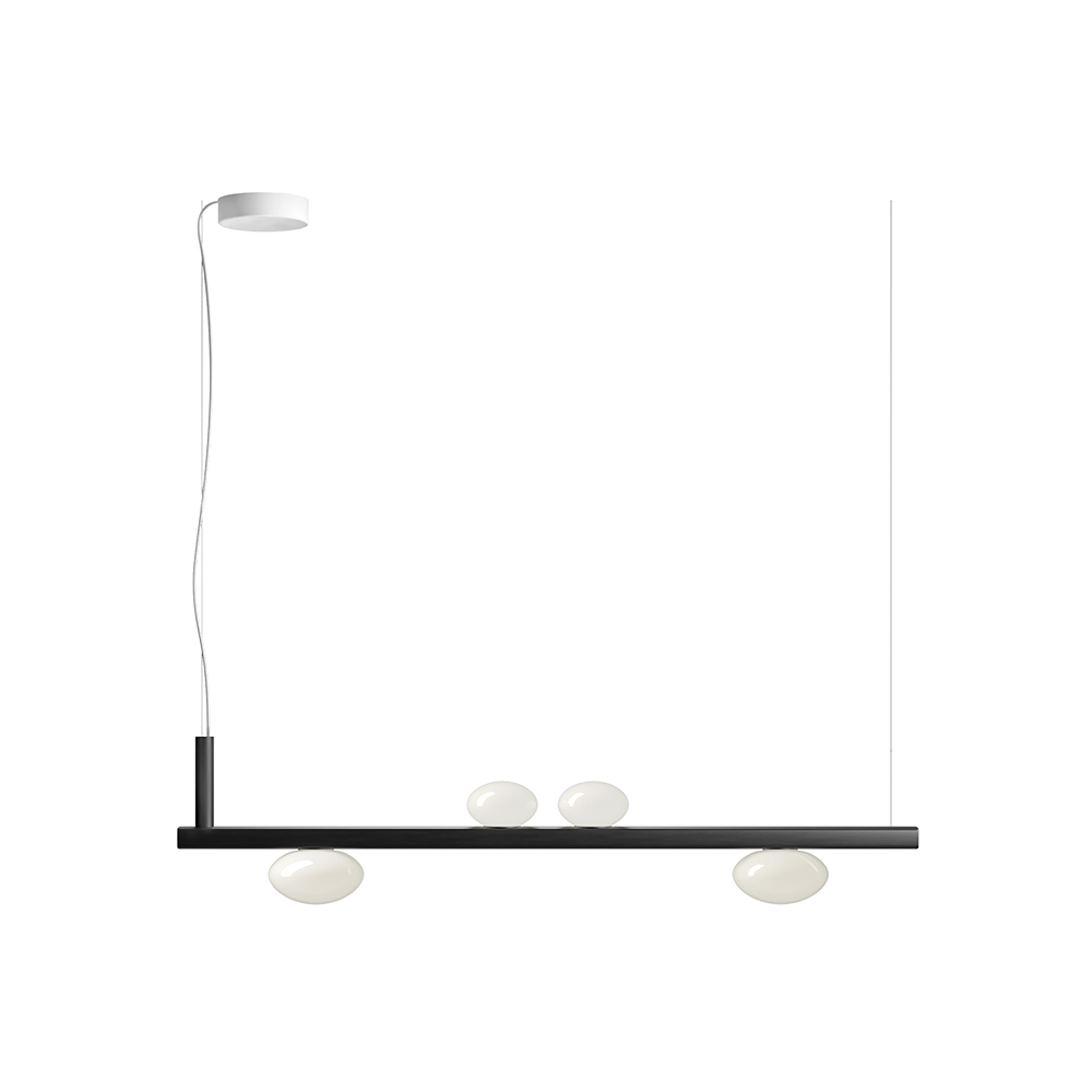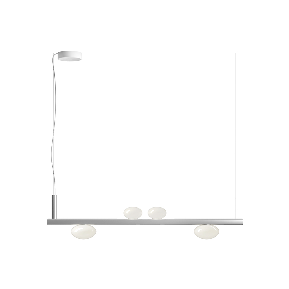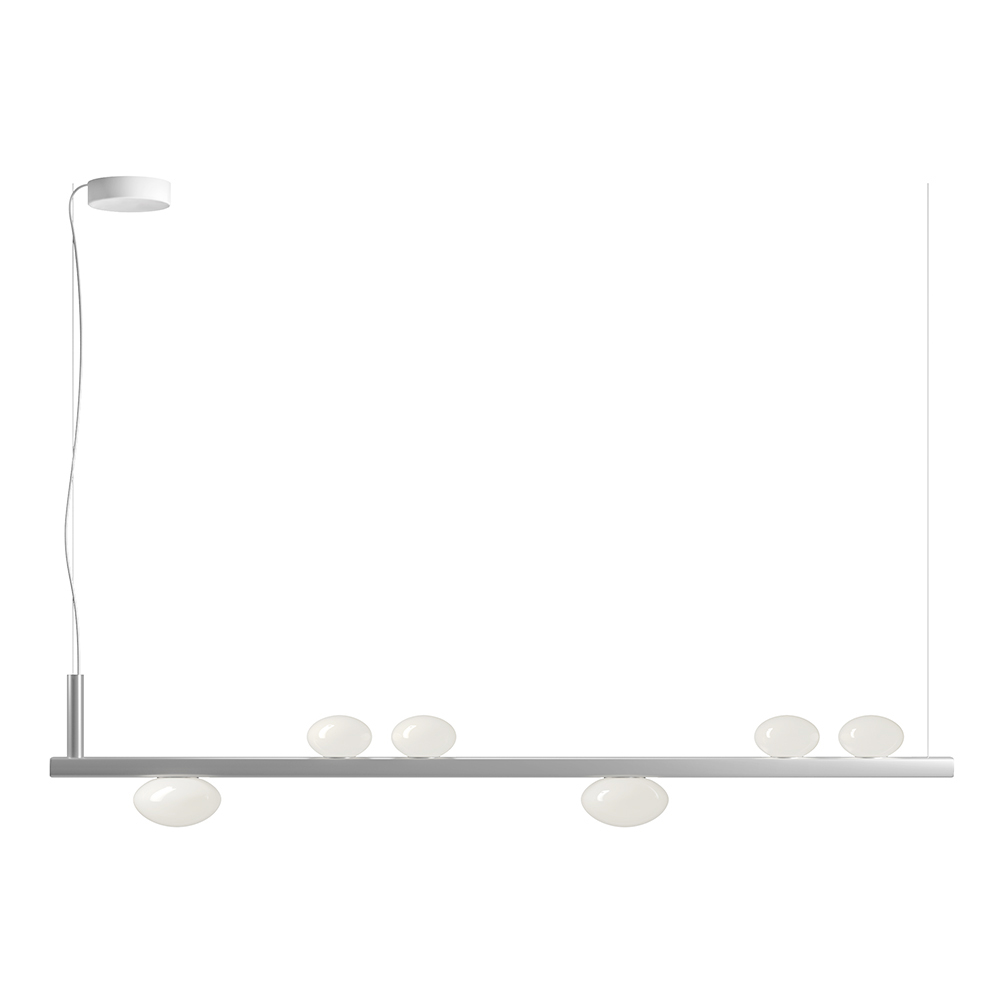 Questo lampadario a sospensione è una vera icona di design intelligente e tecnologia discreta. La sua struttura lineare e pulita si abbina a eleganti diffusori sferici in vetro opalino, che sembrano sospesi in equilibrio, creando un effetto visivo moderno e leggero.