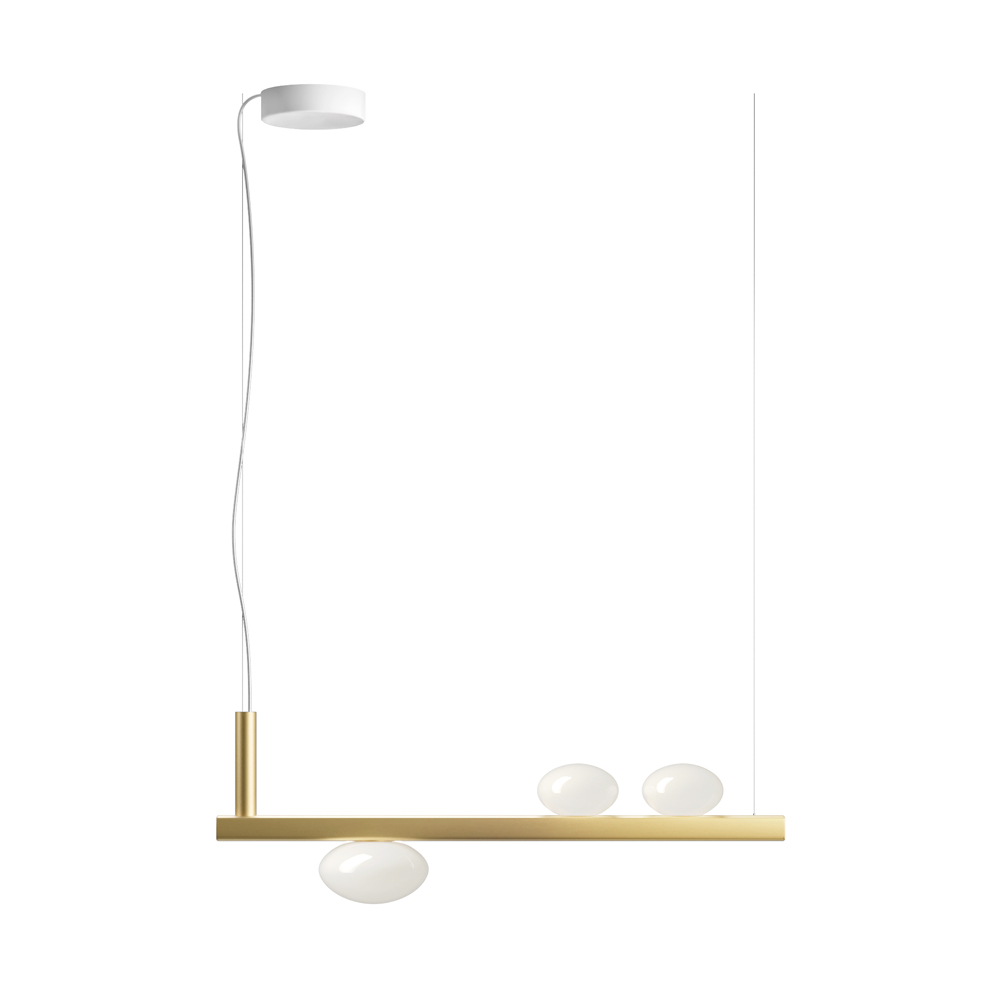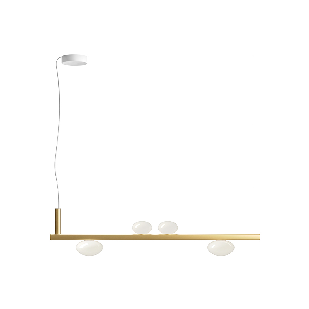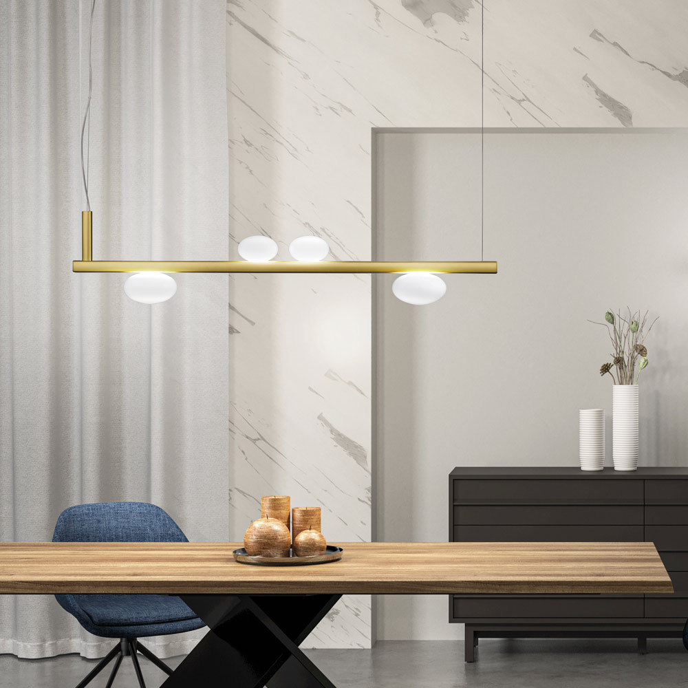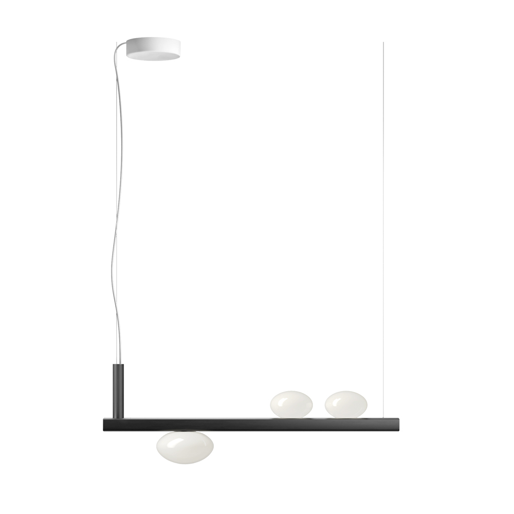 Questo lampadario a sospensione è una vera icona di design intelligente e tecnologia discreta. La sua struttura lineare e pulita si abbina a eleganti diffusori sferici in vetro opalino, che sembrano sospesi in equilibrio, creando un effetto visivo moderno e leggero.