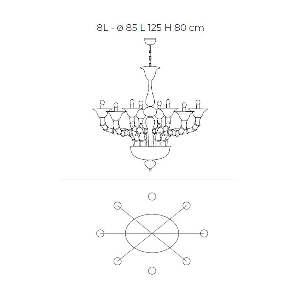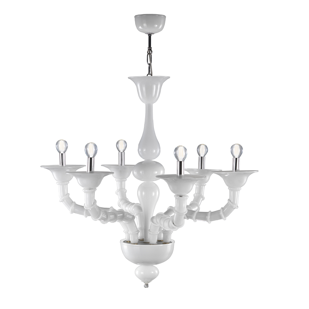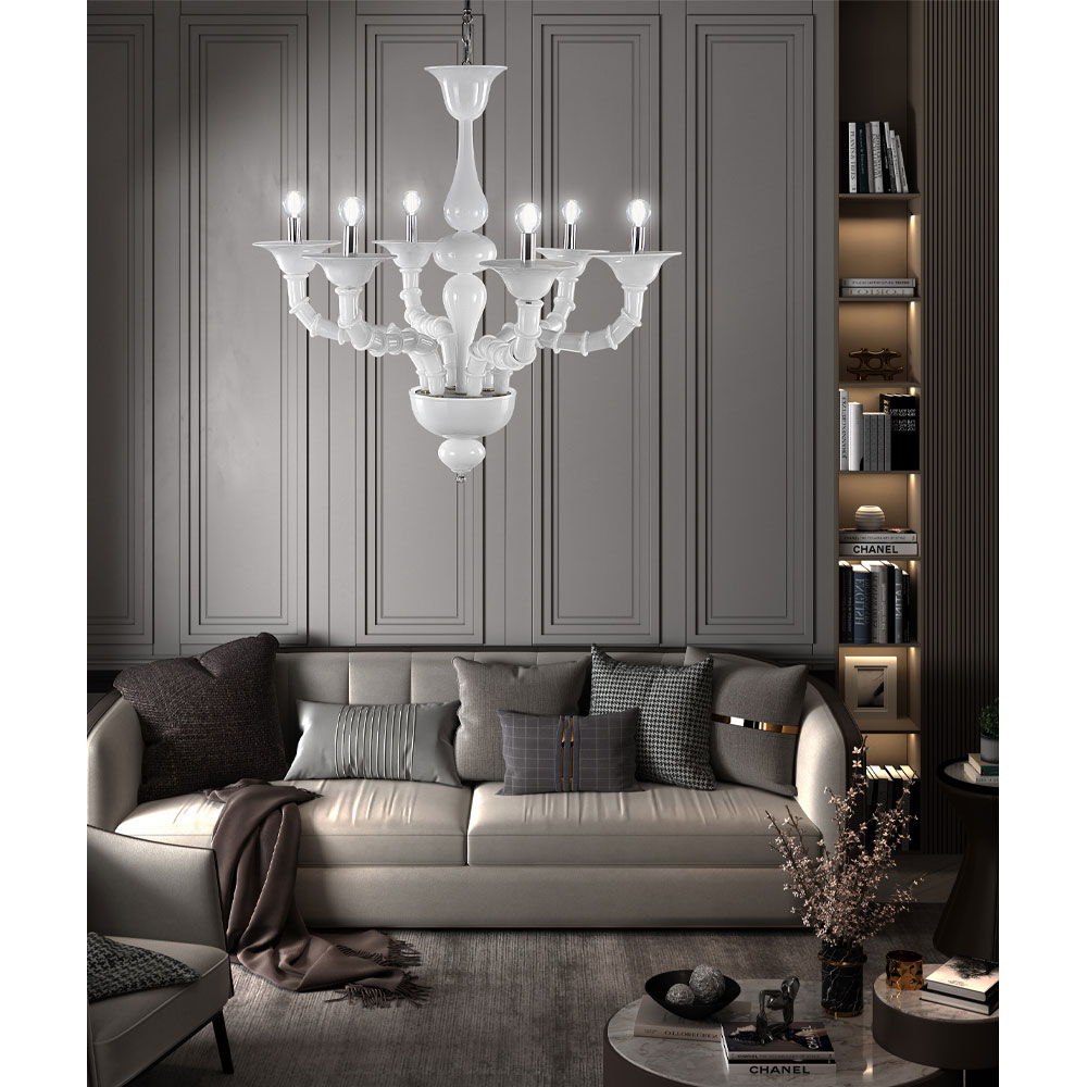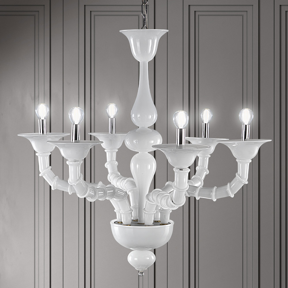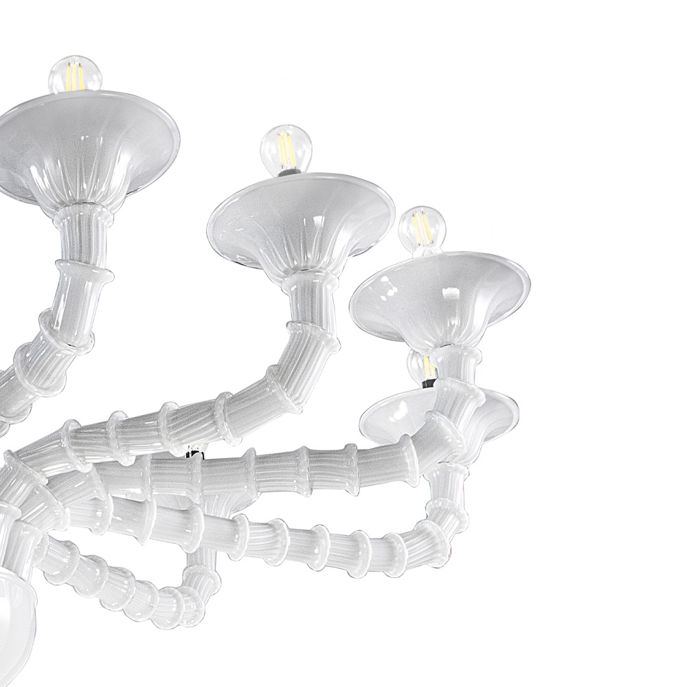 vetro bianco rezzonico soffiato a mano pensato per completare ampie zone della casa come sale da pranzo o salotti dando vita ad un'illuminazione di elevato pregio e dalla personalità intrigante. La lunghezza dei bracci è resa possibile grazie alla particolare tecnica definita a "bossole" che consiste nell'incastrare più parti in vetro dando prova di
