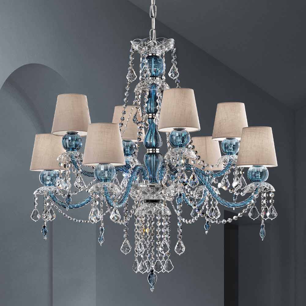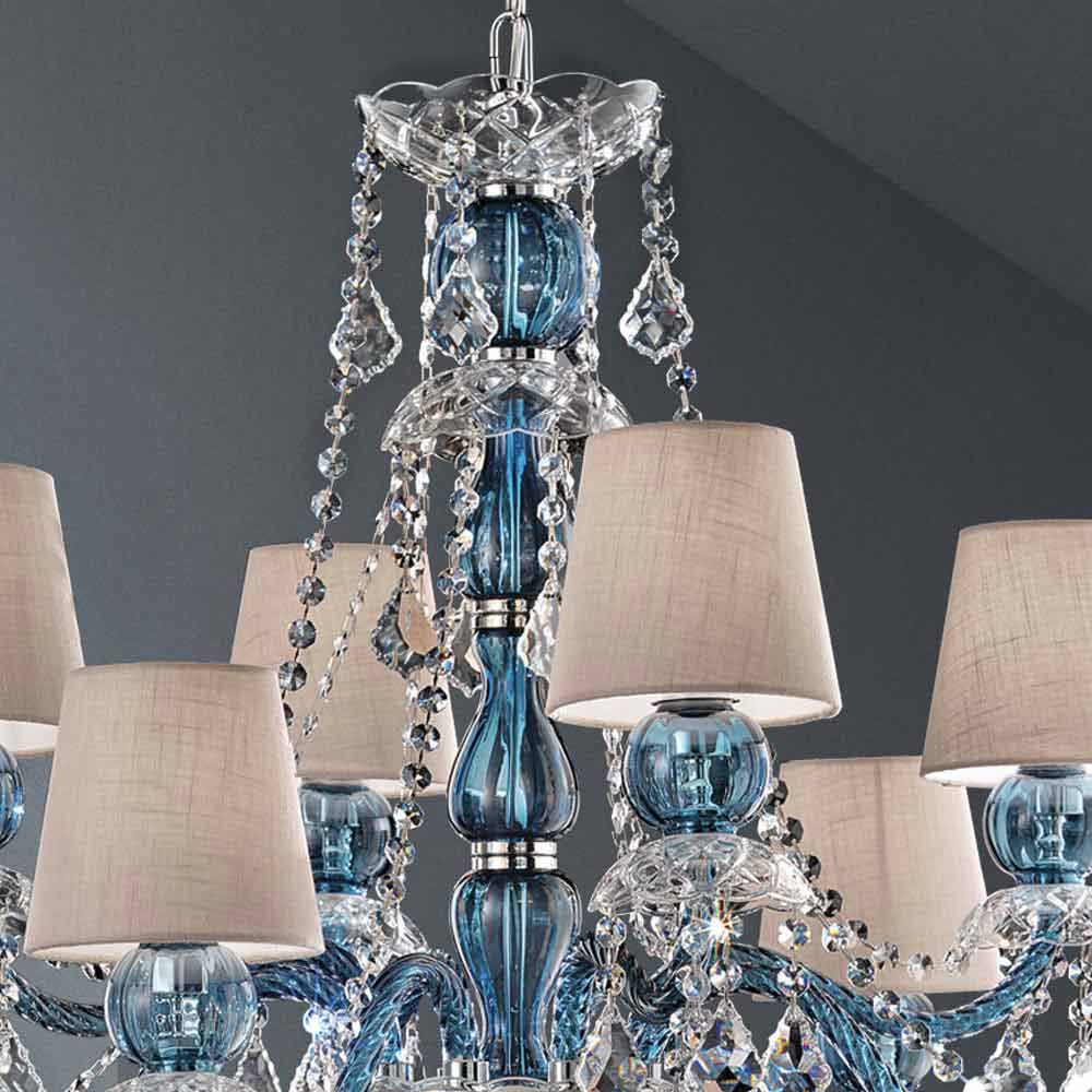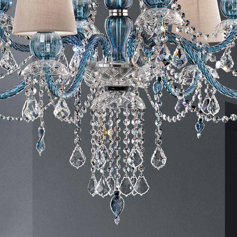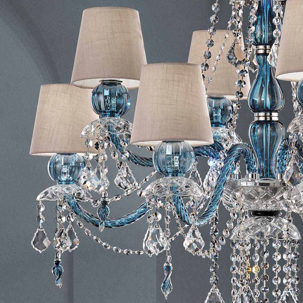 Maestoso lampadario a 8 luci con paralumi in lino, struttura in vetro di Venezia finitura blu arricchito da pendagli in finitura cristallo piombo e dettagli in metallo cromo lucido, realizzato artigianalmente in Italia. Un complemento d'arredo dal carattere estremamente romantico che completa gli ambienti creando una meravigliosa atmosfera dall'eleganza senza tempo. In questo lampadario la luce soffusa converge con il dinamismo degli inediti effetti luminosi creati dai brillanti pendagli che, grazie alla rifrazione della luce, danno vita a bagliori colorati dal forte impatto visivo.