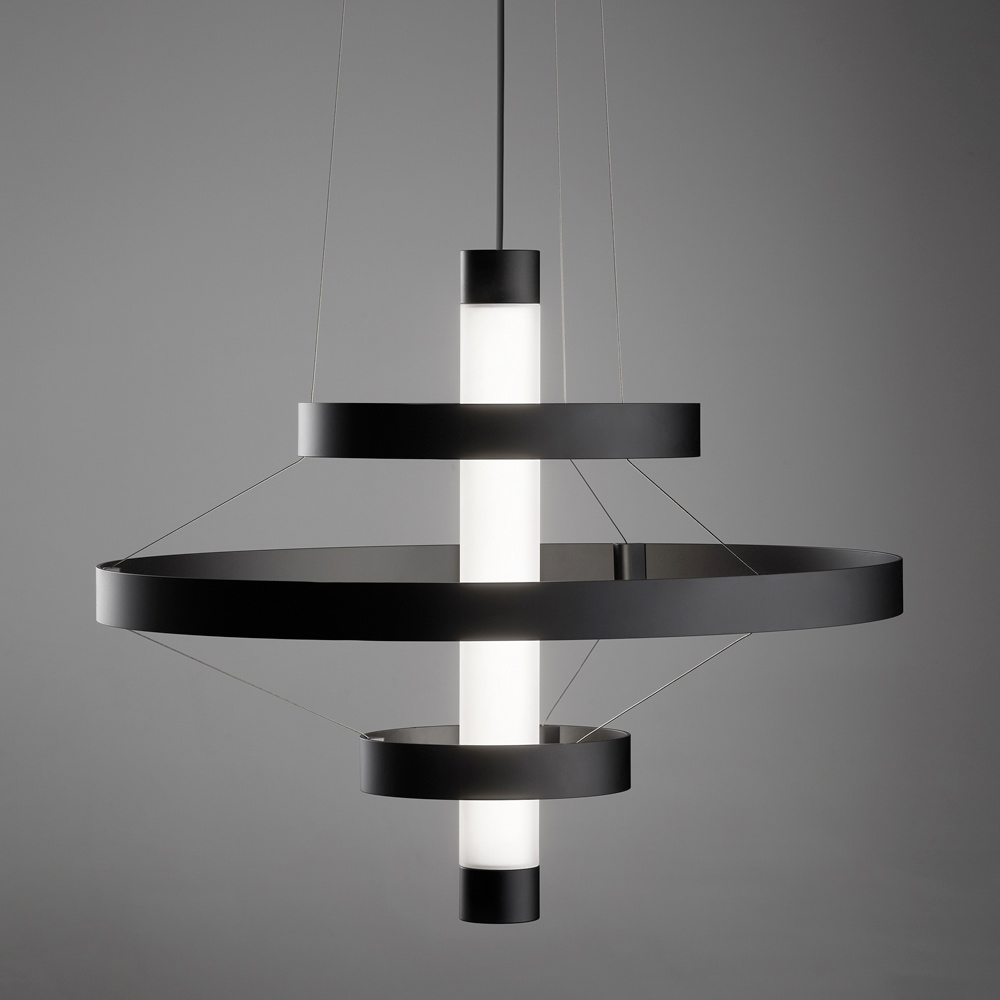 Questo lampadario a sospensione è un vero protagonista dello spazio: una scultura luminosa che cattura lo sguardo e dona personalità e prestigio all’ambiente. La struttura è composta da una serie di anelli concentrici in alluminio, disposti in modo armonioso attorno al corpo centrale, creando un effetto visivo dinamico, elegante e tridimensionale.