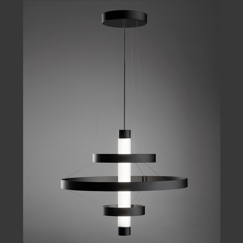 Lampadario da interno realizzato con un corpo centrale in vetro, fulcro di luce e di energia, intorno al quale si dispone una serie di anelli di varie dimensioni che sembrano sospesi nello spazio in alluminio.