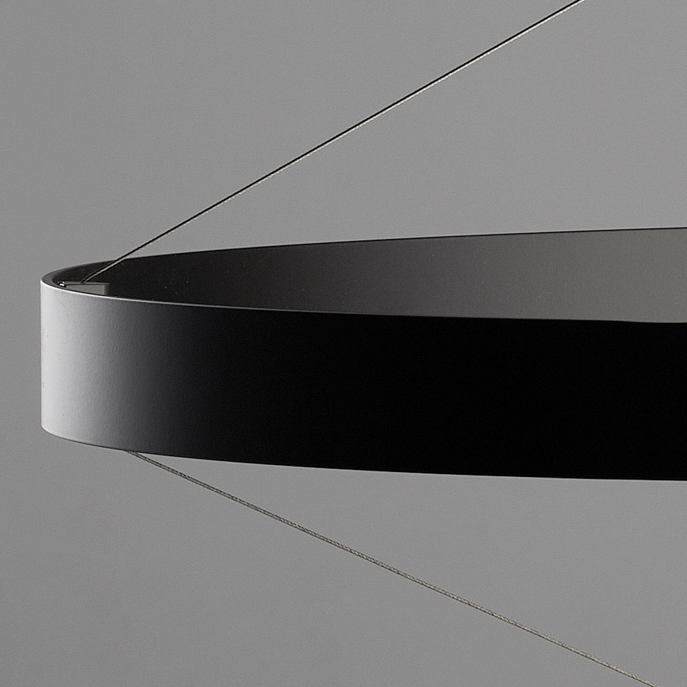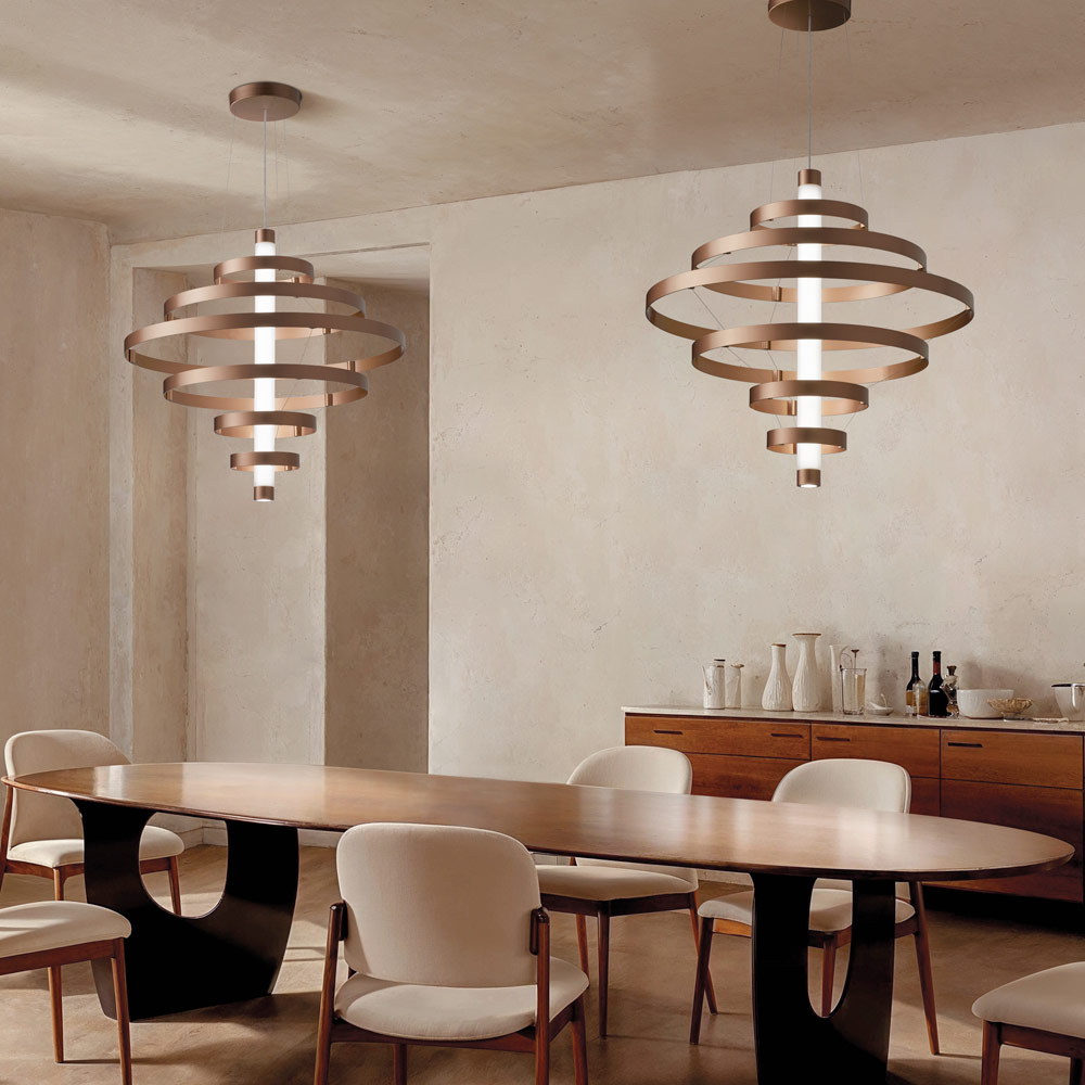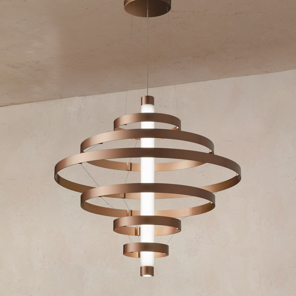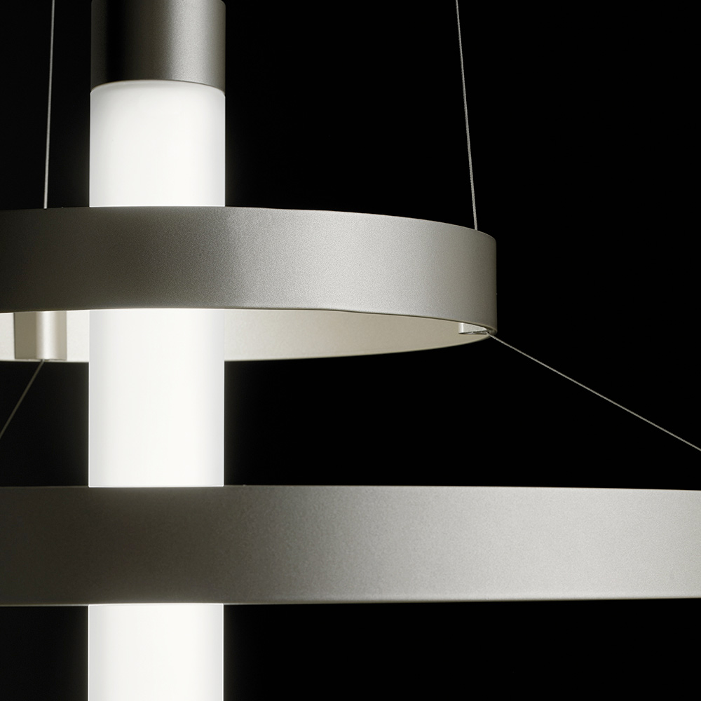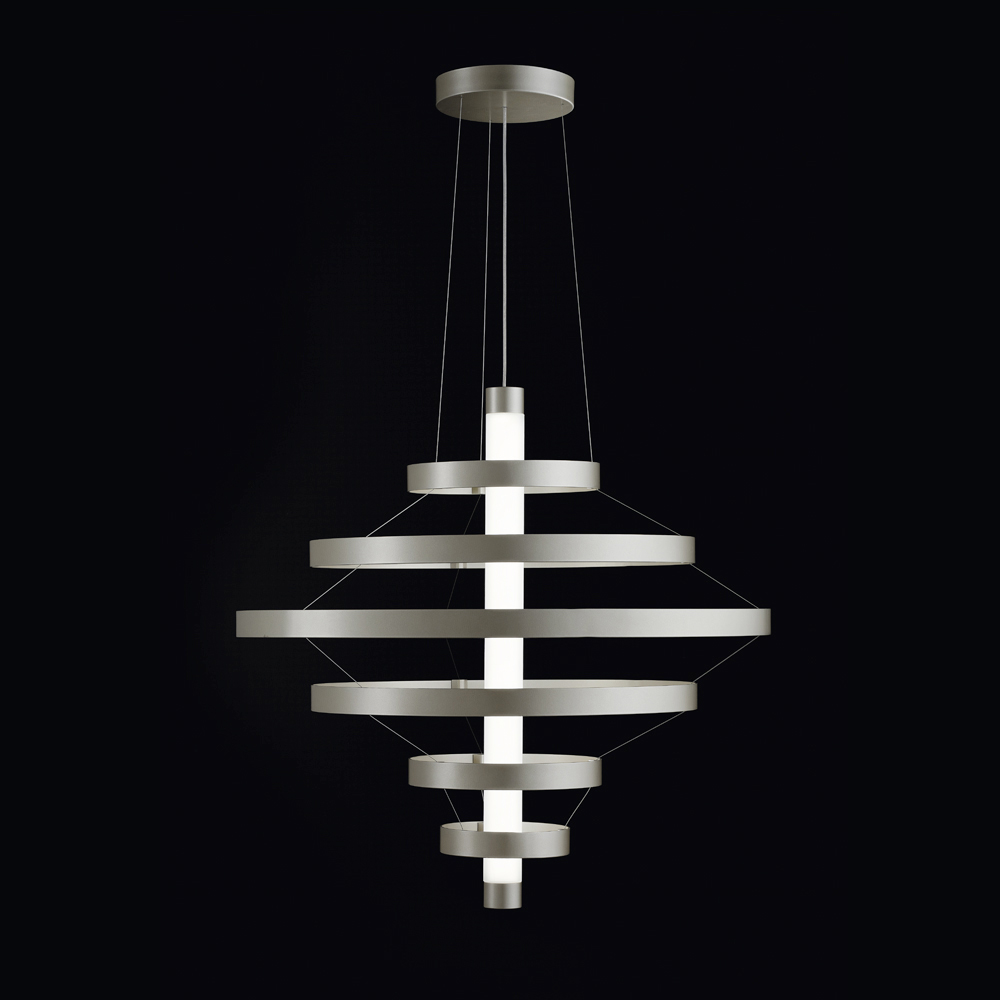 Questo lampadario a sospensione è un vero protagonista dello spazio: una scultura luminosa che cattura lo sguardo e dona personalità e prestigio all’ambiente. La struttura è composta da una serie di anelli concentrici in alluminio, disposti in modo armonioso attorno al corpo centrale, creando un effetto visivo dinamico, elegante e tridimensionale.