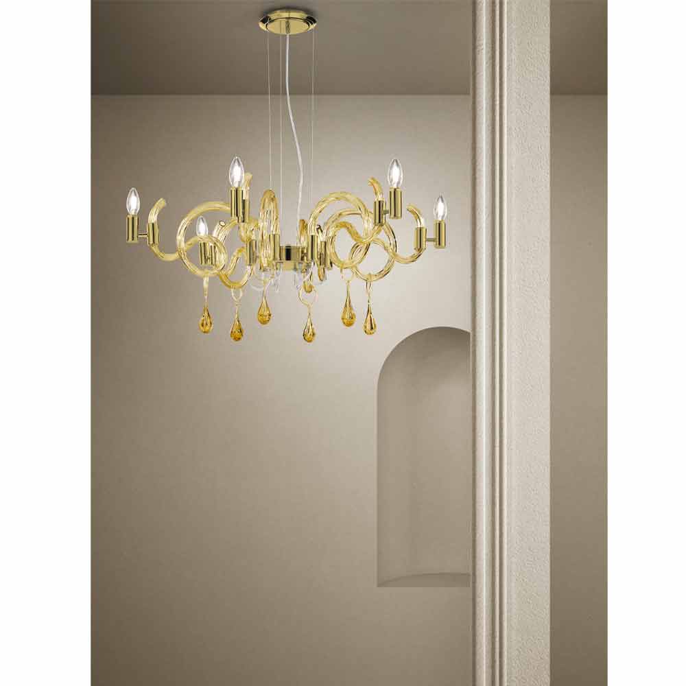 Raffinato lampadario a 6 luci realizzato a mano in Italia in vetro veneziano finitura ambra con dettagli in metallo dorato lucido. L'abile maestria artigiana si fonde con elementi di stampo contemporaneo per dare vita ad un'originale evoluzione del vetro capace di completare con il suo forte valore decorativo spazi moderni così come ambienti dallo stile classico. Il meraviglioso tocco dato dalle gocce pendenti crea come l'illusione di vera e propria pioggia accrescendo così il lato estetico del prodotto stupendo grazie alla sua personalità scenografica.