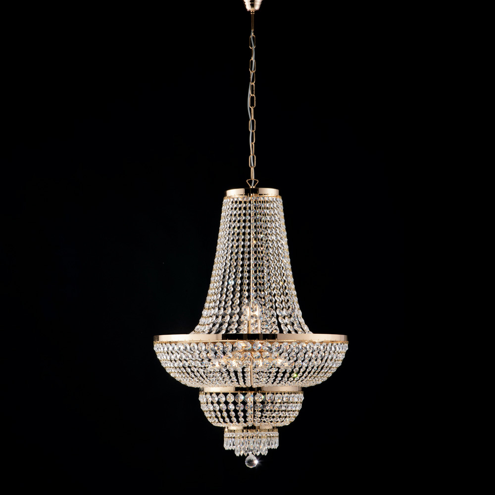 Scenografico, luminoso e di grande prestigio, questo lampadario classico di lusso in ferro e ottone con strass è pensato per ambienti che desiderano distinguersi con eleganza. La struttura slanciata, impreziosita da cascate di strass brillanti, riflette la luce creando un raffinato gioco di riflessi che valorizza ogni spazio.
