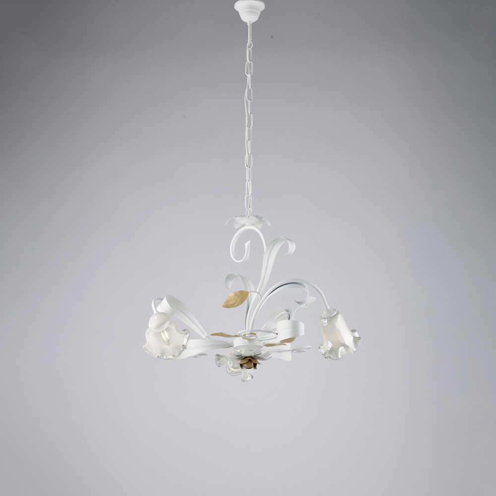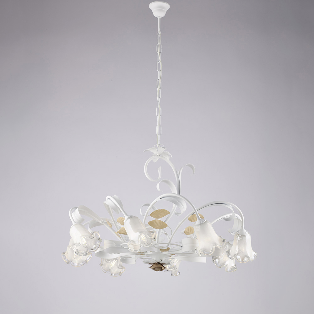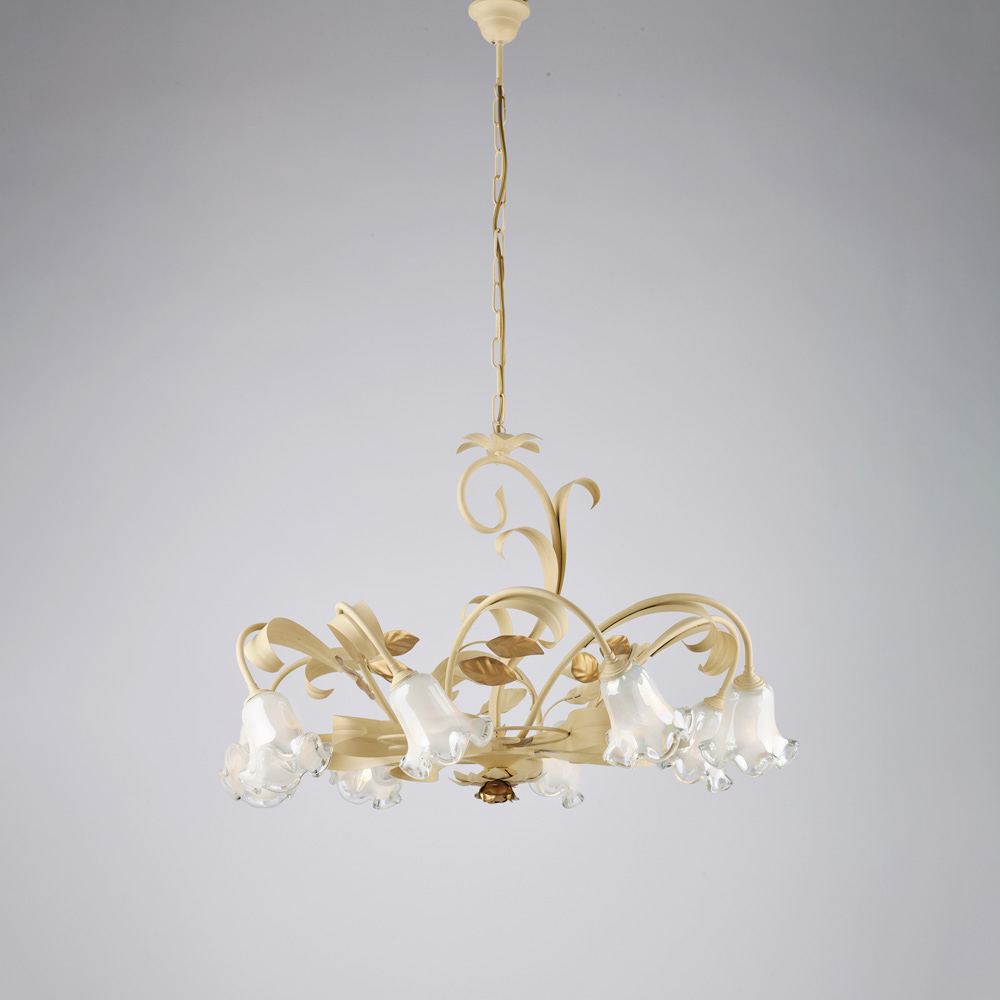 Romantico ed elegante, questo lampadario classico artigianale in ferro laccato avorio décapé è una creazione luminosa che richiama il fascino della tradizione italiana, reinterpretata con gusto raffinato. La struttura sinuosa, arricchita da riccioli decorativi e coprilampada in vetro a fiore, dona leggerezza e armonia all’insieme, creando un’atmosfera calda e accogliente.