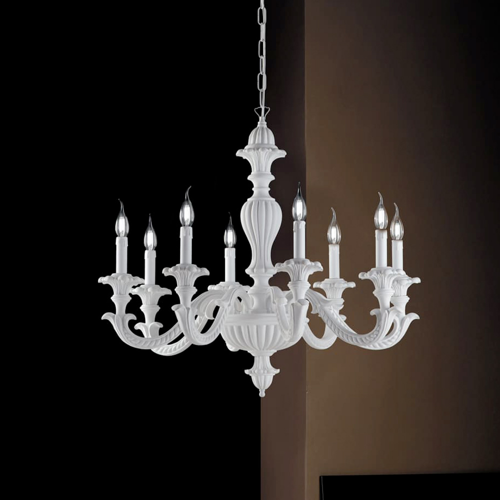 Disponibile nella delicata finitura Bianco Shabby, dal carattere romantico e luminoso, oppure nella preziosa variante Avorio con Foglia Oro, ideale per ambienti eleganti e di rappresentanza, questo lampadario si inserisce armoniosamente in soggiorni, sale da pranzo, ingressi importanti, salotti classici e ambienti contract di prestigio.