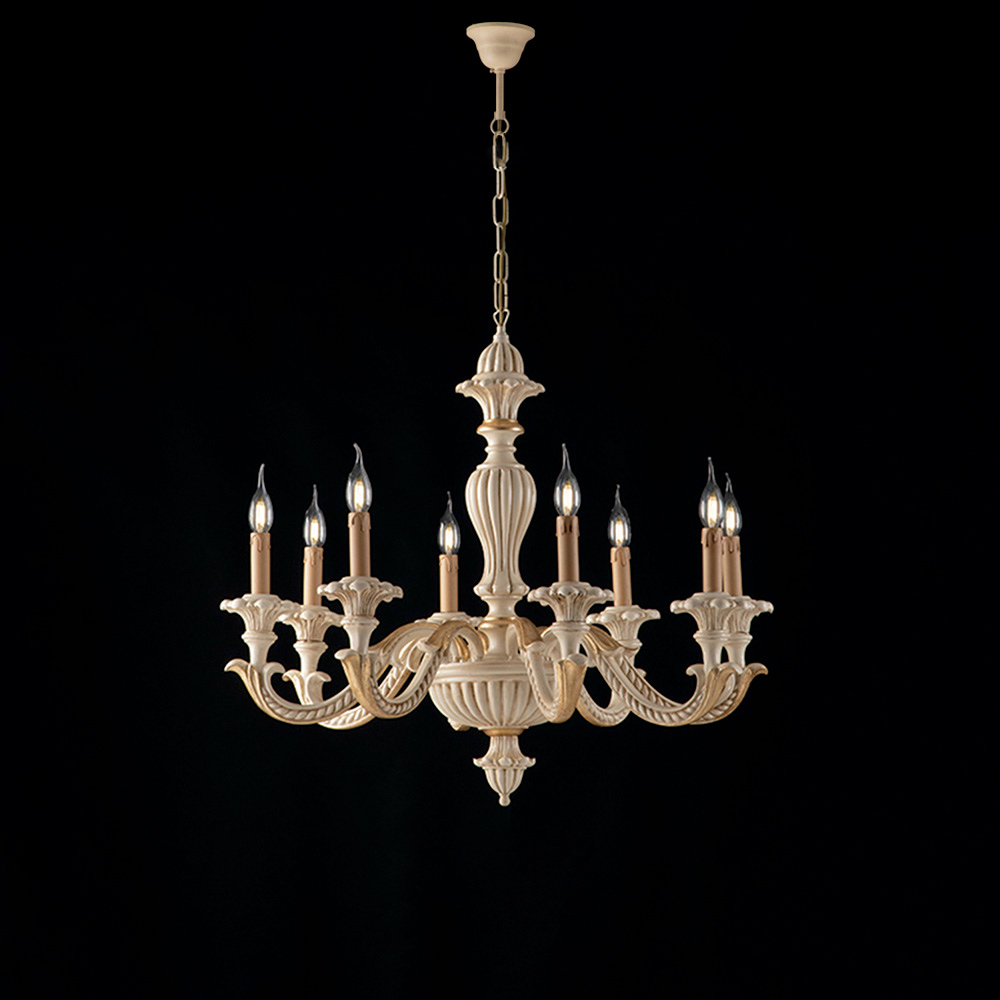 Espressione autentica dell’eleganza artigianale italiana, questo lampadario classico in legno è un vero capolavoro decorativo, capace di trasformare la luce in un elemento d’arredo di grande fascino. La struttura finemente lavorata, con bracci sinuosi e dettagli torniti, richiama lo stile tradizionale dei lampadari d’epoca, reinterpretato con gusto raffinato.