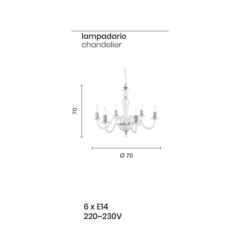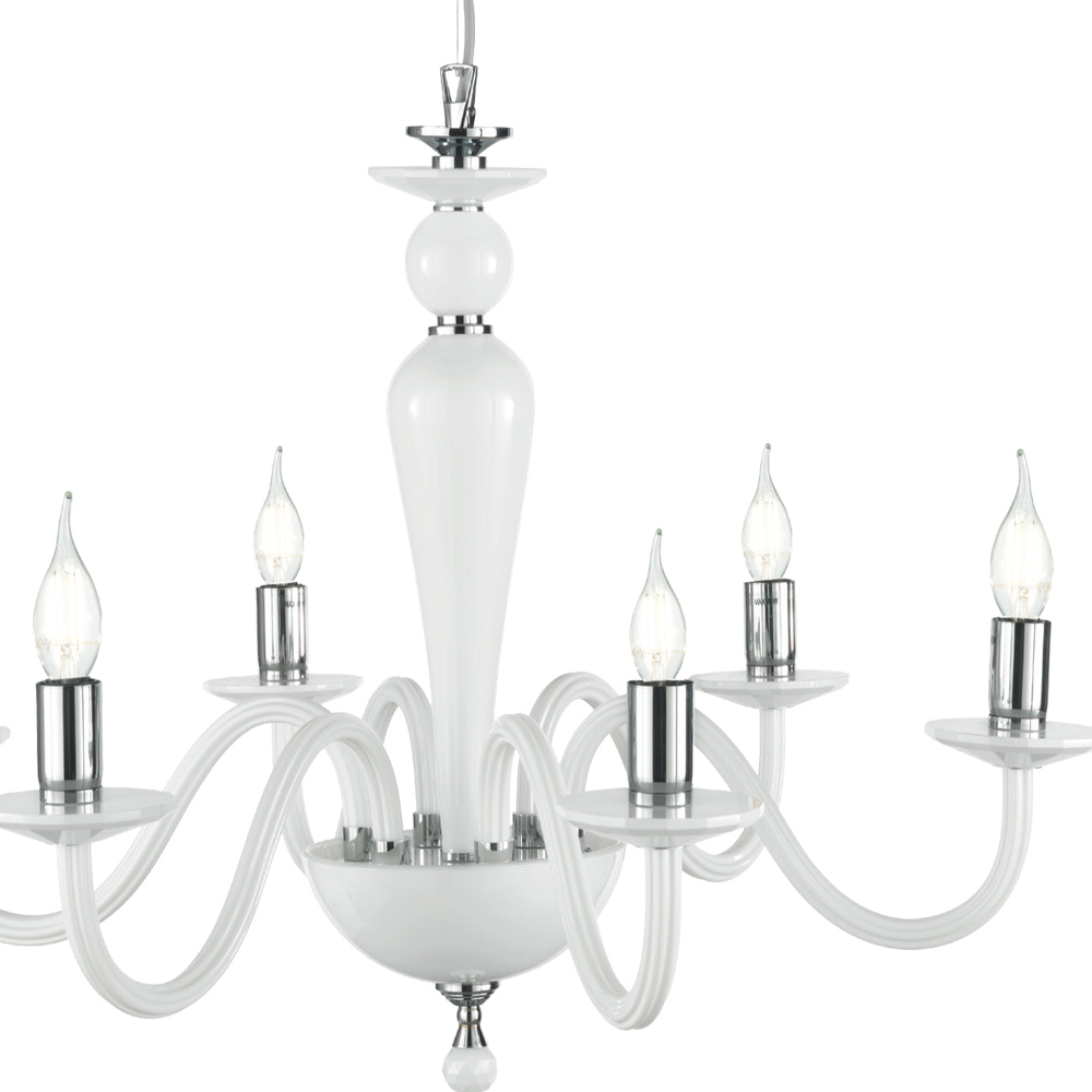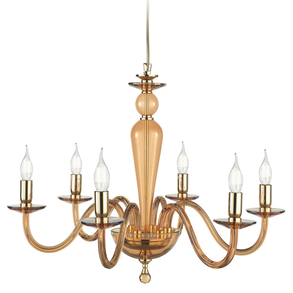 Questo lampadario a sospensione dallo stile classico si compone di 6 braccia ad arco realizzate in vetro lavorato a mano in Italia che sorreggono i piattini ospitanti le sorgenti luminose.
