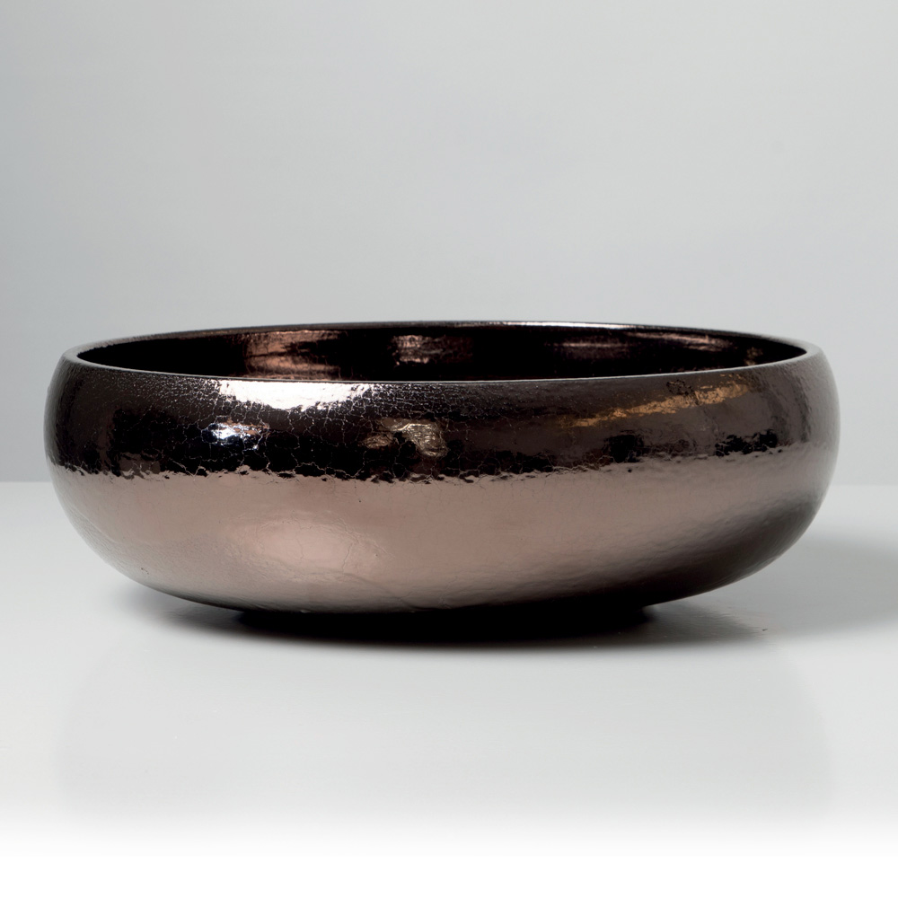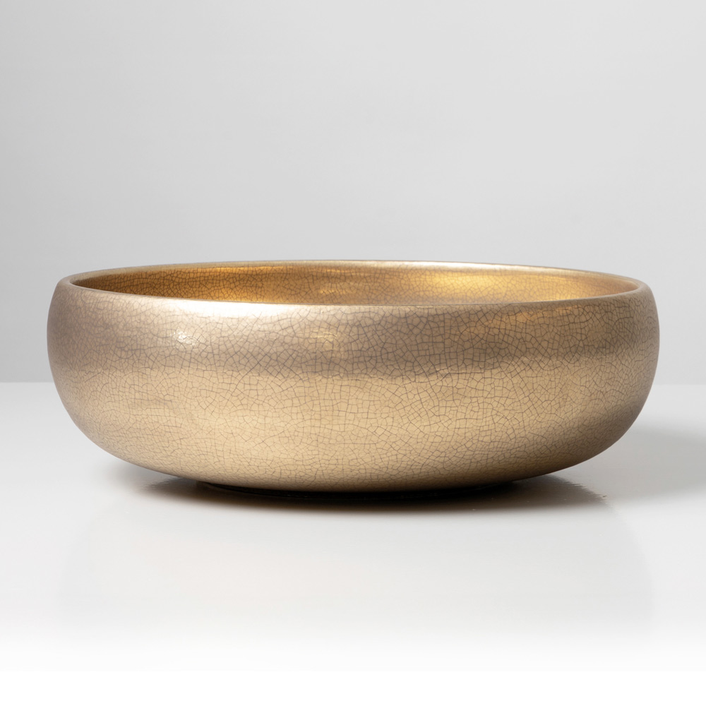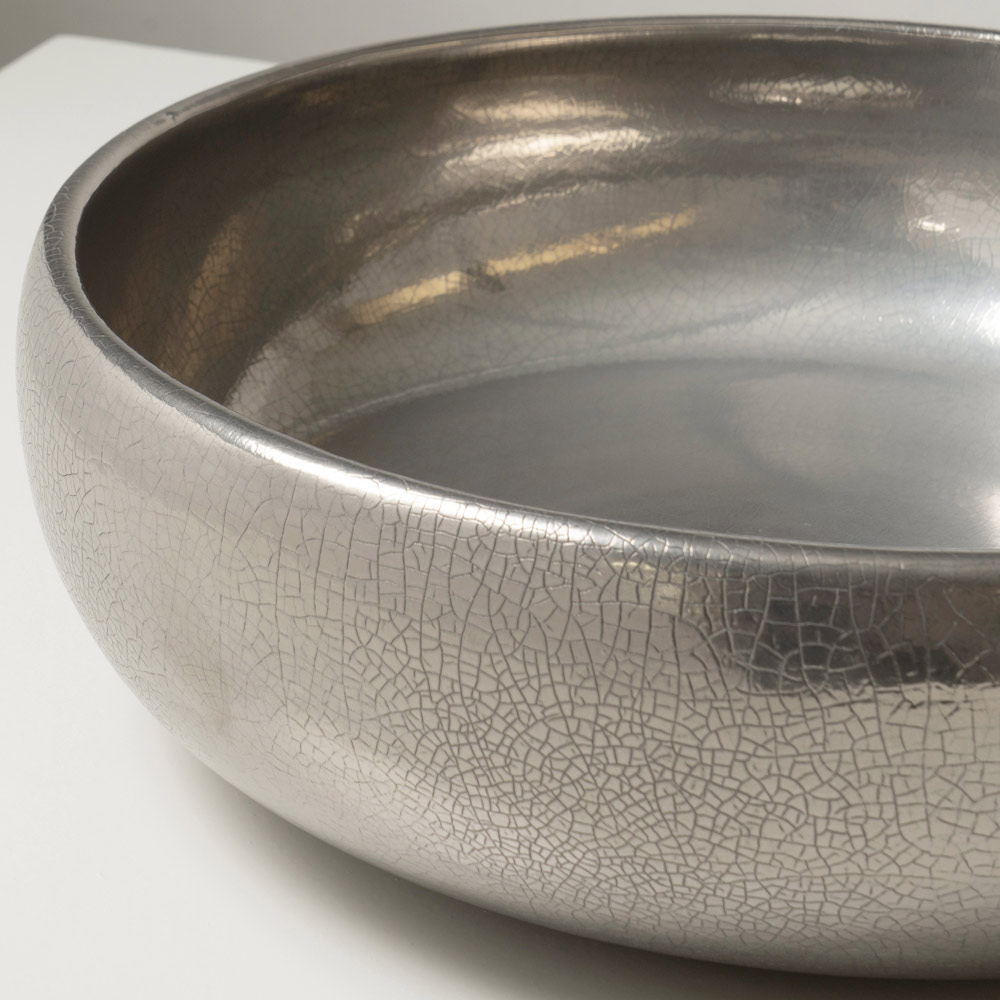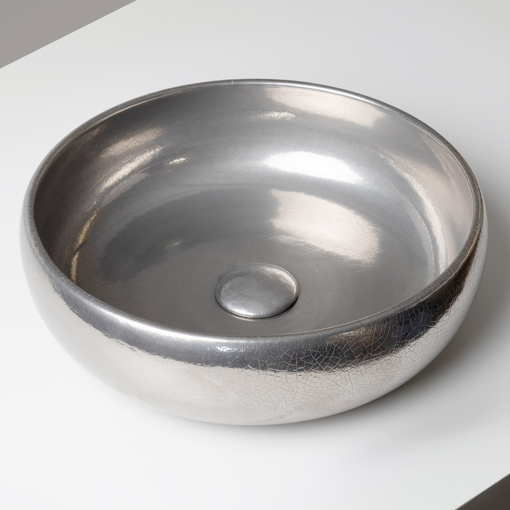 La superficie è impreziosita da raffinate finiture metalliche craquelé, applicate sia all’interno che all’esterno del lavabo. Le micro-fratture dello smalto creano riflessi profondi e cangianti, conferendo al prodotto un aspetto lussuoso e fortemente decorativo. Ogni lavabo è unico, grazie alle naturali variazioni generate dalla lavorazione artigianale.