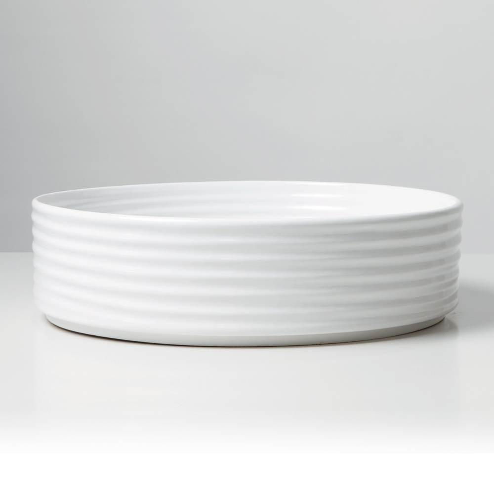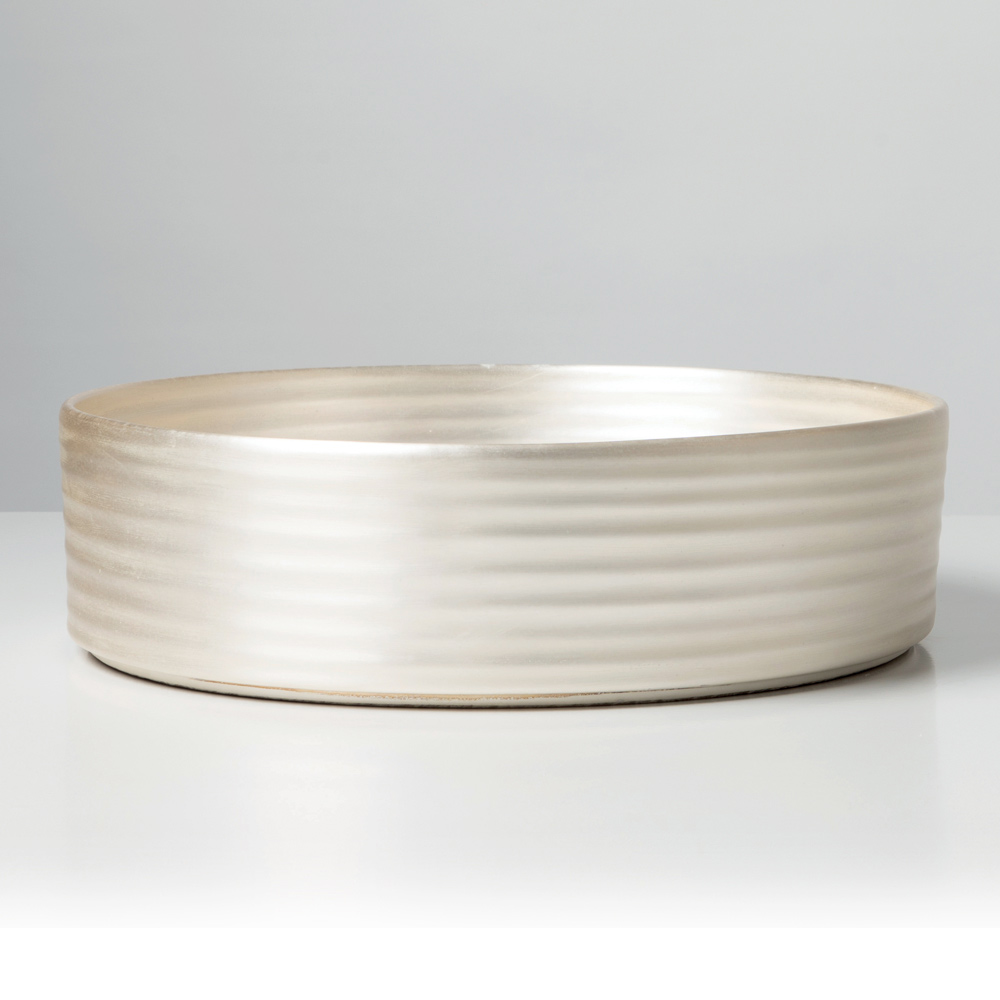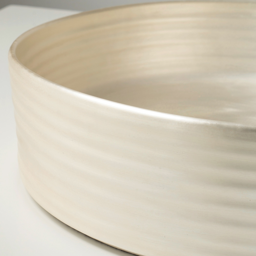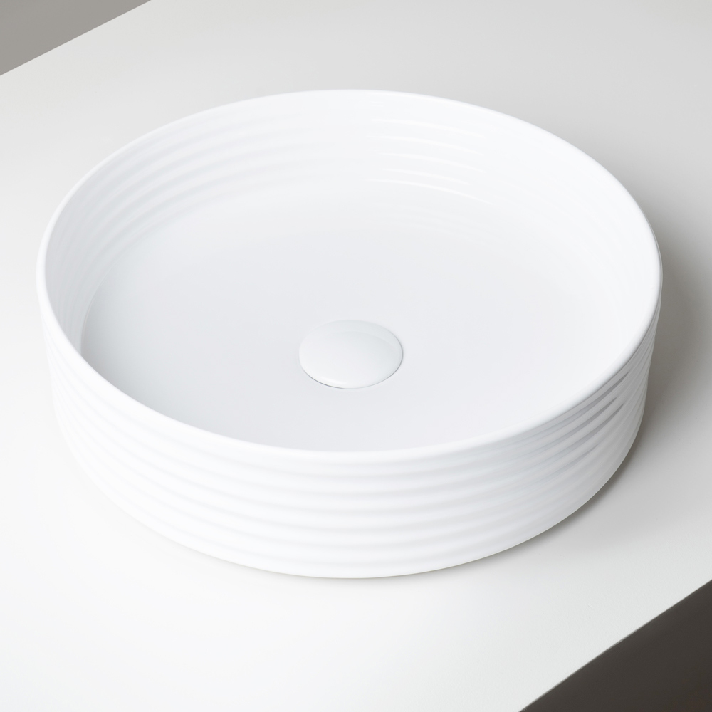 Il lavabo d’appoggio è realizzato in gres porcellanato tornito a mano e rappresenta una sintesi perfetta tra ricerca formale e maestria artigianale. Le superfici ondulate dialogano con la luce, creando riflessi morbidi e continui che trasformano la materia in una presenza fluida ed elegante.