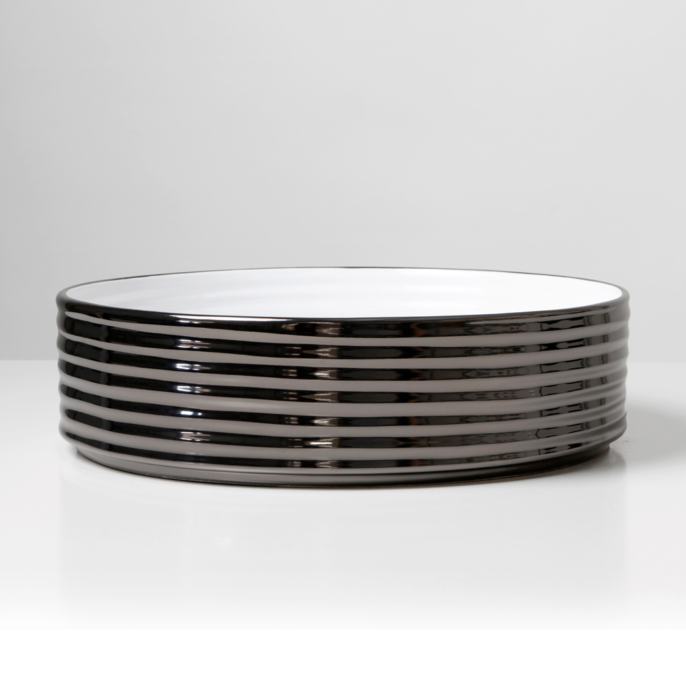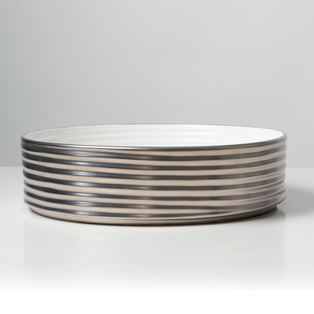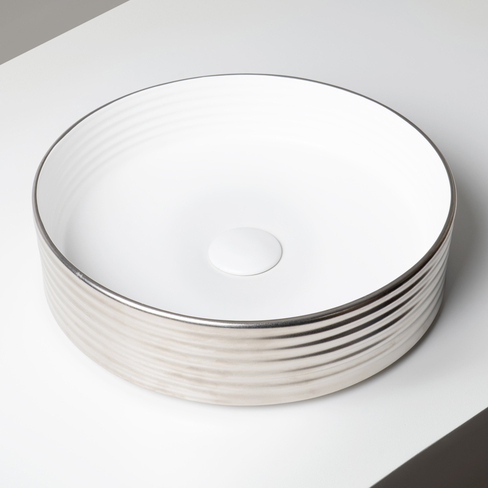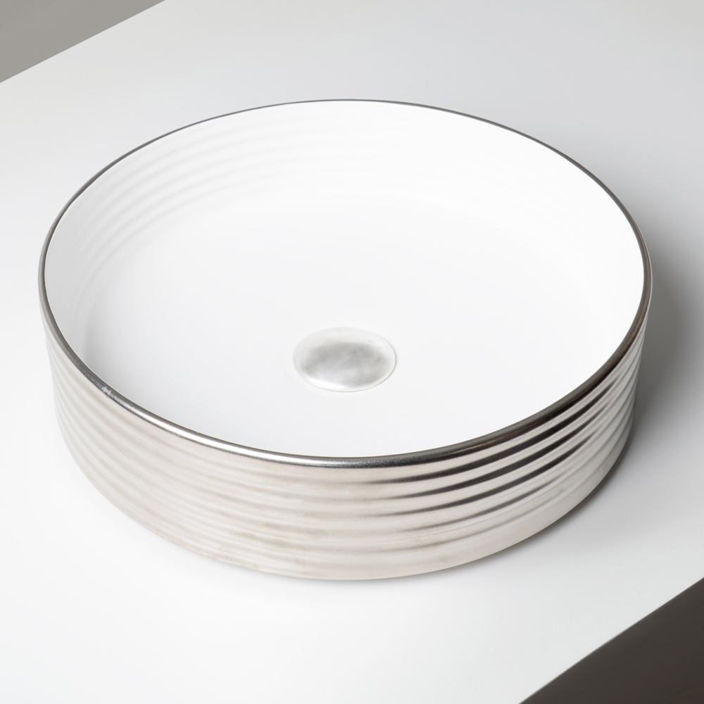 Questo lavabo d’appoggio in gres porcellanato è realizzato tramite tornitura manuale e si distingue per le sue superfici ondulate a fasce orizzontali, capaci di catturare la luce e trasformare la materia in un elemento fluido, morbido e raffinato. Un oggetto di design che unisce ricerca estetica e maestria artigianale.