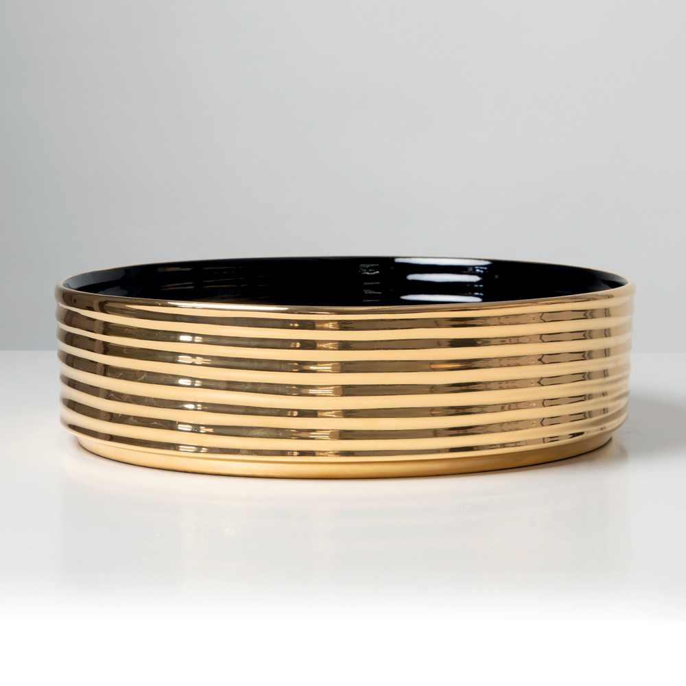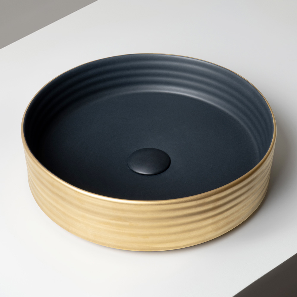 Il contrasto tra l’interno smaltato e le finiture esterne dona al lavabo un carattere prezioso e contemporaneo, rendendolo un vero gioiello per l’ambiente bagno. La palette cromatica, elegante e sofisticata, valorizza il volume con riflessi cangianti e profondità materica.