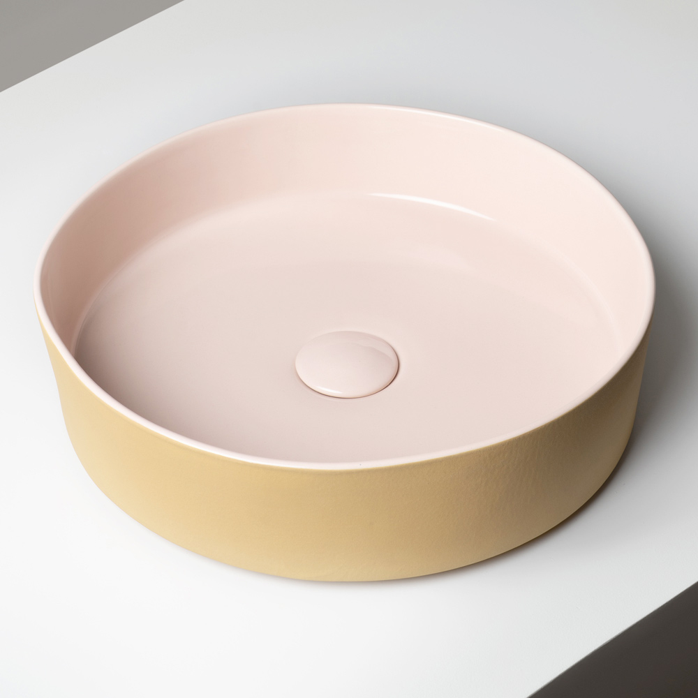La forma essenziale e compatta è valorizzata da un raffinato contrasto tra interni lucidi ed esterni opachi, creando un elegante gioco visivo tra superfici e tonalità. Le combinazioni cromatiche, ispirate a una palette vivace e sofisticata, rendono ogni lavabo un vero elemento decorativo.