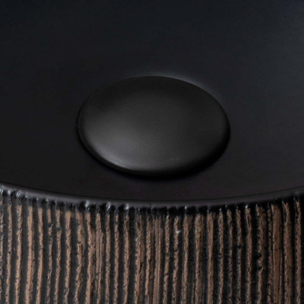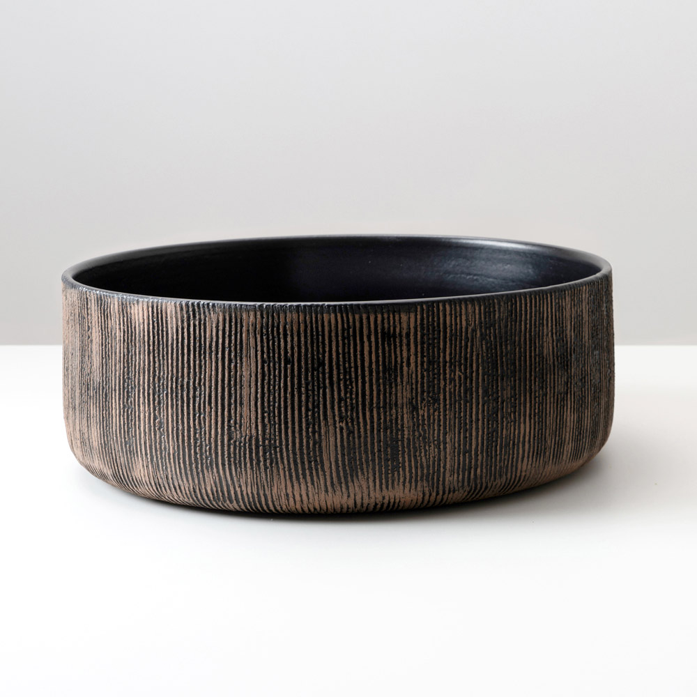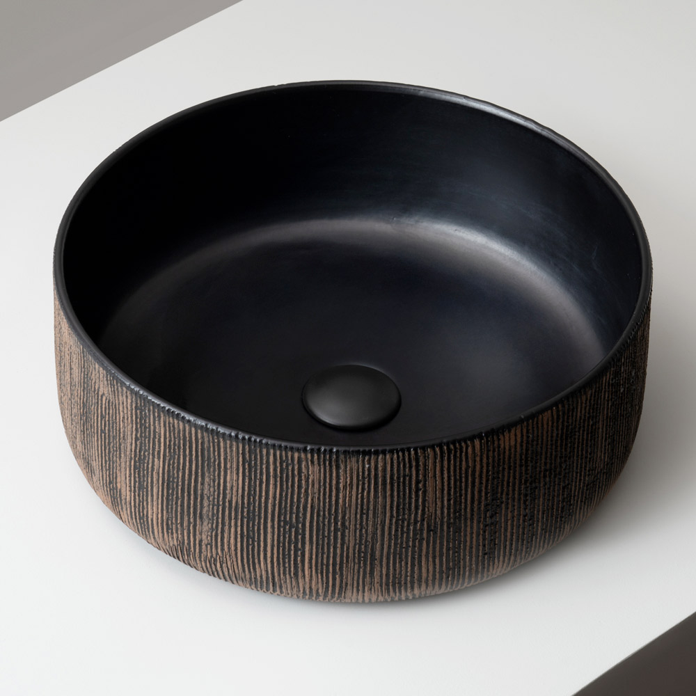 L’interno è rifinito con smalto nero opaco oppure perlato opaco, in elegante contrasto con la superficie esterna lasciata naturale, valorizzando l’autenticità del materiale e la lavorazione artigianale.
