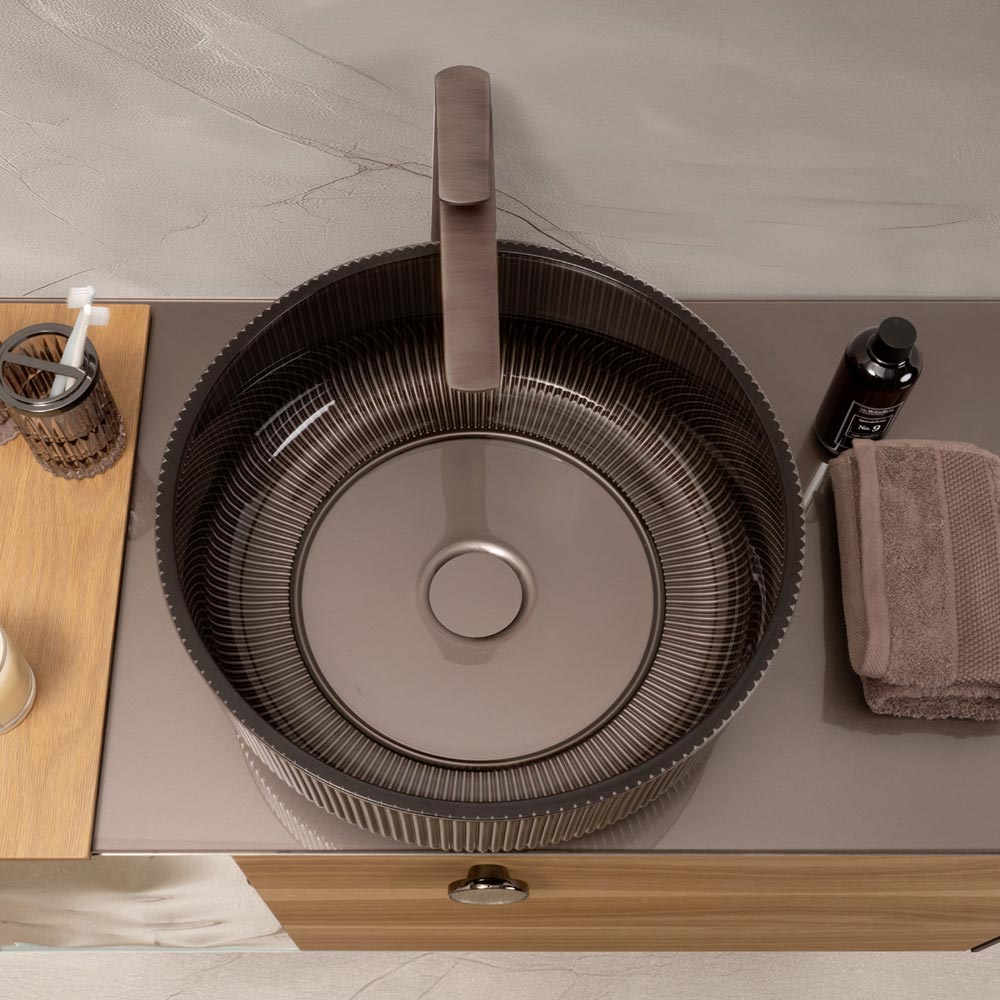 Disponibile in versioni cromatiche sofisticate, il lavabo si adatta sia a contesti dal gusto classico che a spazi dal design contemporaneo, conferendo sempre un carattere esclusivo e ricercato. Le tonalità, unite alla luminosità naturale del vetro, donano profondità e movimento, trasformando il lavabo in una vera e propria opera decorativa.