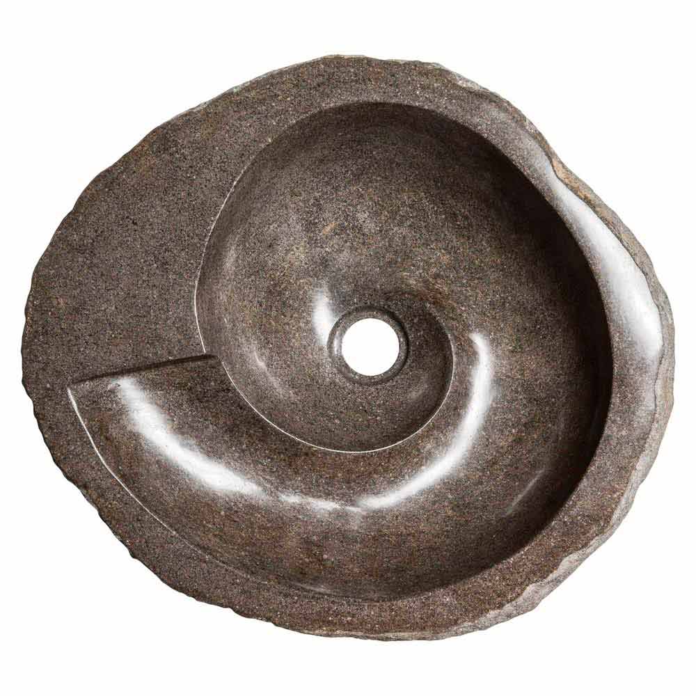 Busca è un fantastico lavandino da appoggio circolare dalla forma irregolare prodotto a mano in pietra di fiume.