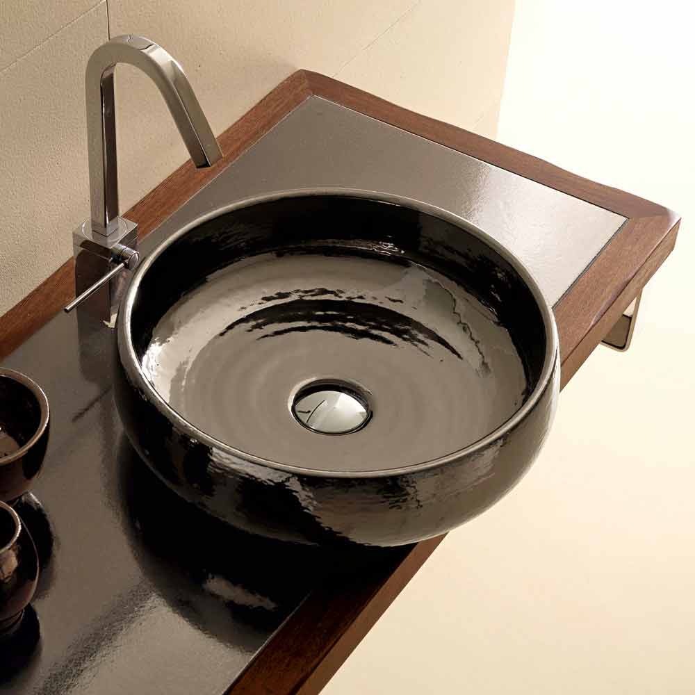 Lavabo per bagno da appoggio fabbricato e tornito a mano in Italia in ceramica raku finitura bruno dorato.