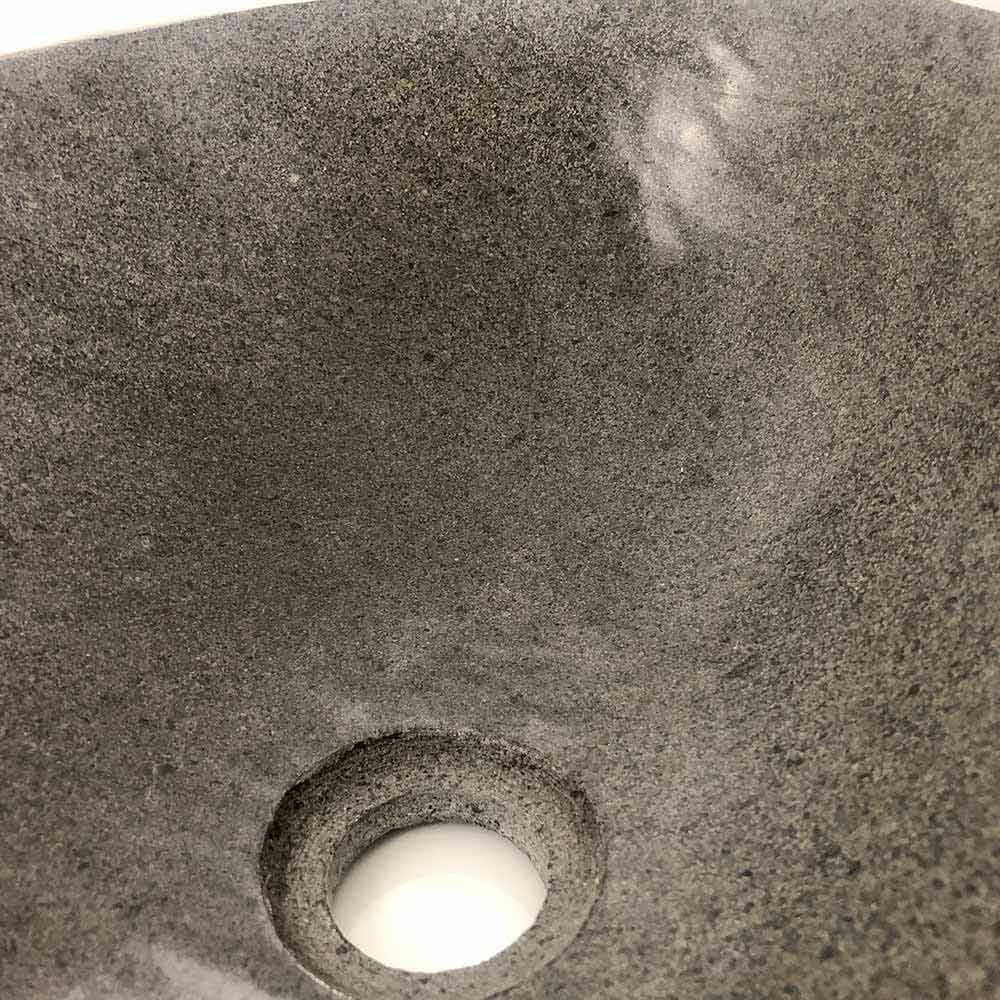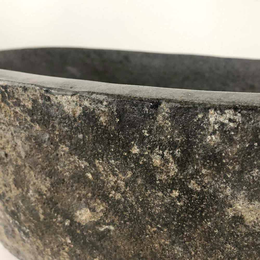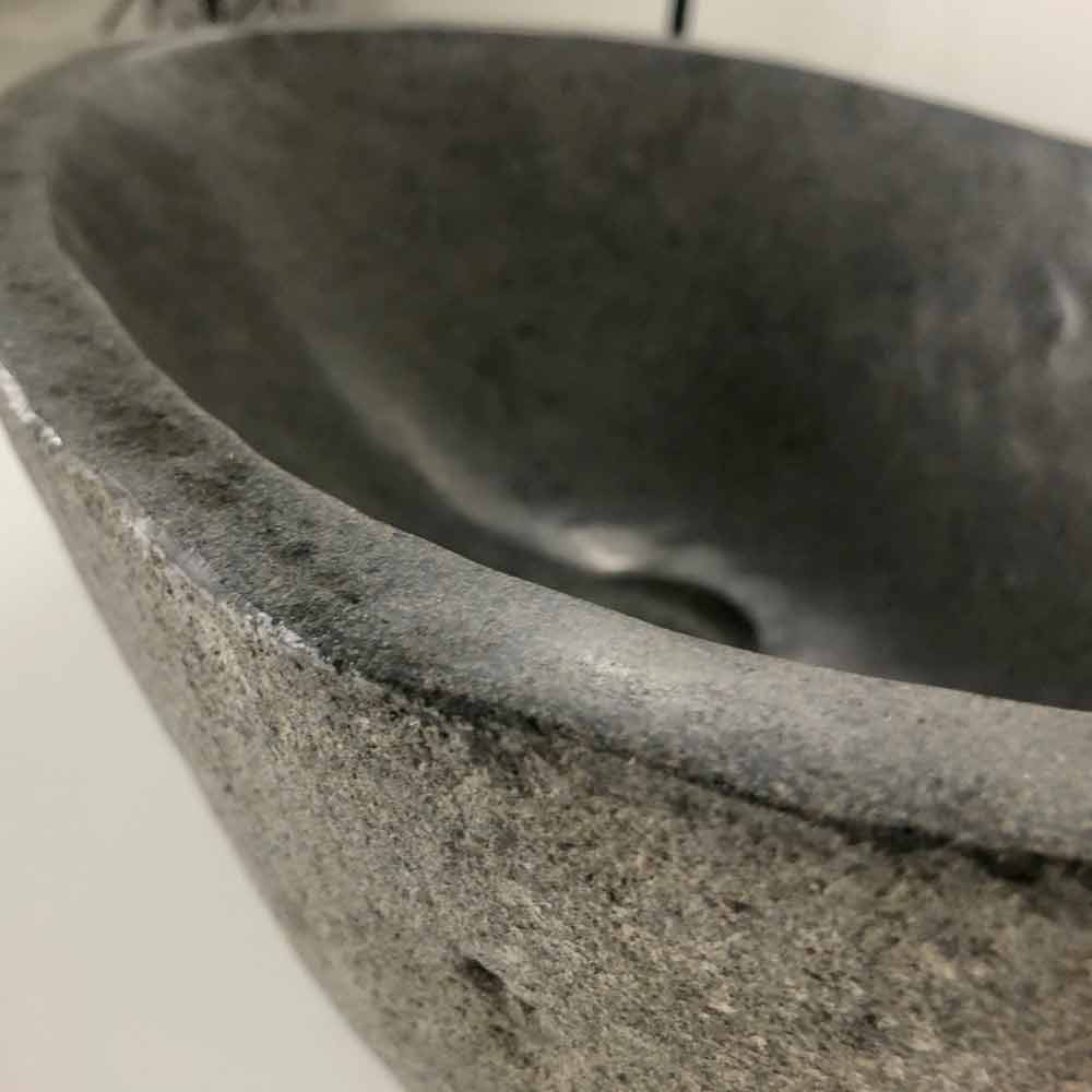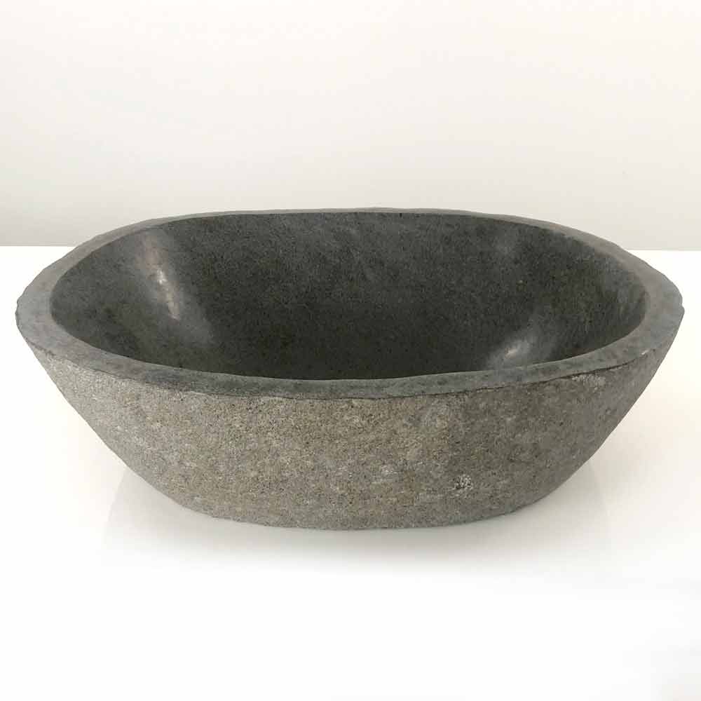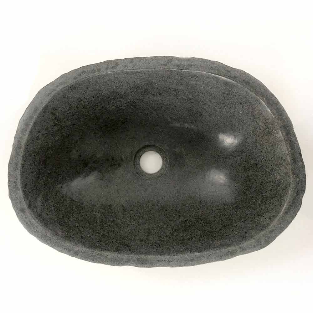 Lavabo da appoggio in pietra di fiume naturale modello Akta, di forma tendente all'ovale.