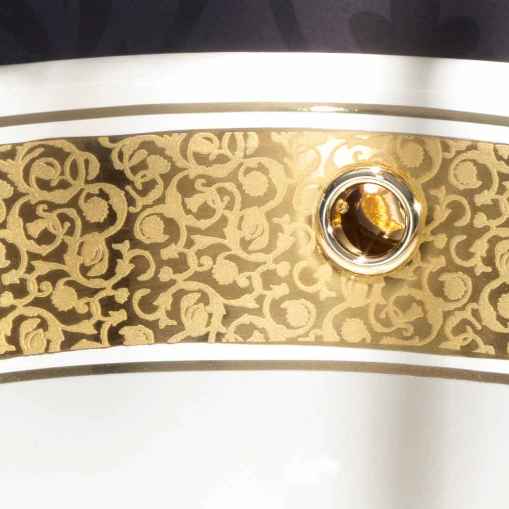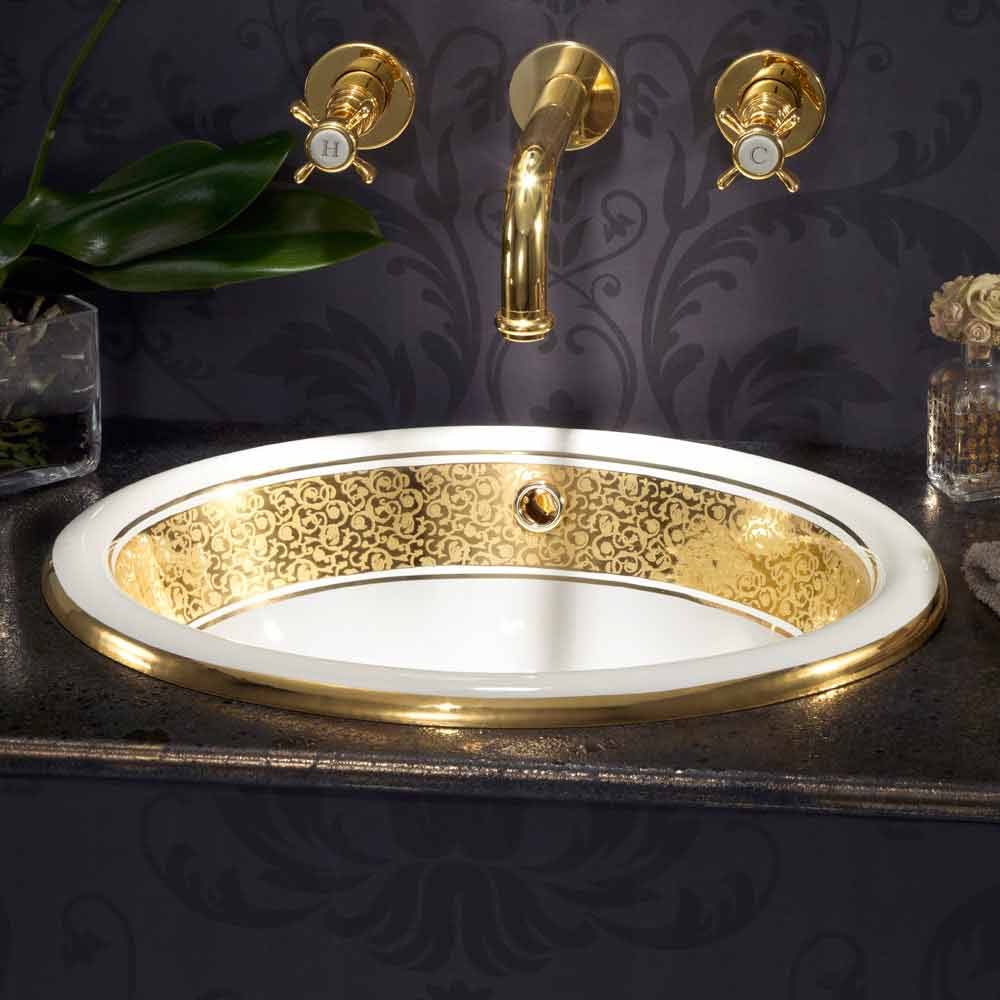 Lavabo da bagno a incasso prodotto in Italia in fire clay lavorato a mano decorato con banda oro a rilievo, due filetti e bordo oro 24 carati.
