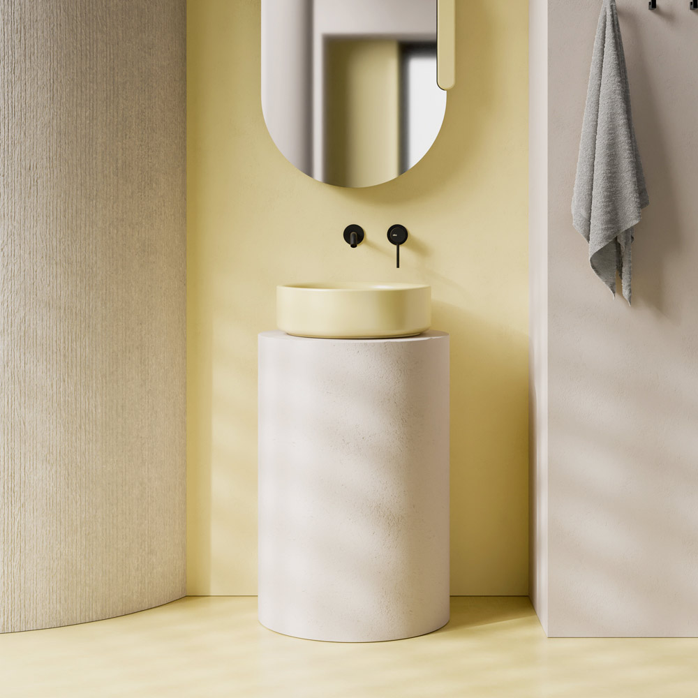 Il suo bordo leggermente spesso conferisce solidità e presenza, mentre la superficie liscia ne esalta la luminosità, rendendolo un vero e proprio punto focale dell’arredo bagno.
