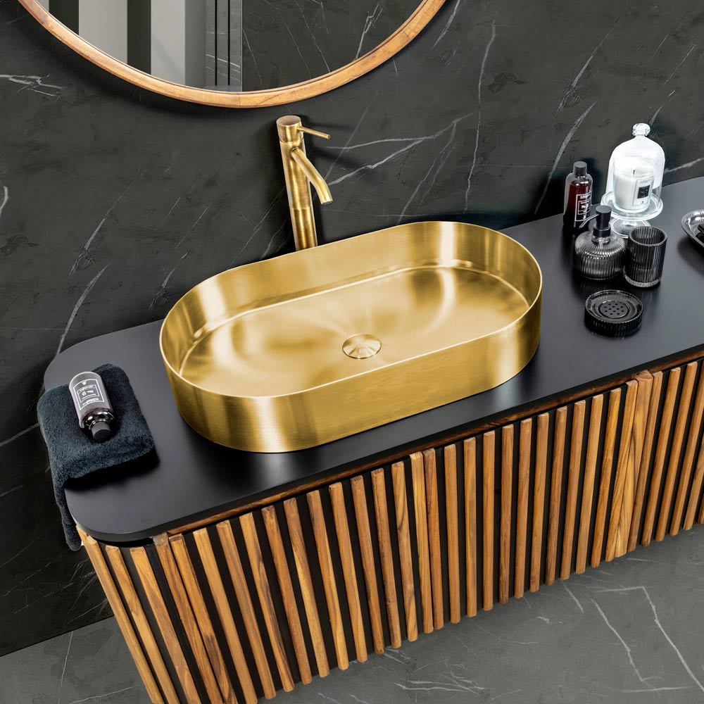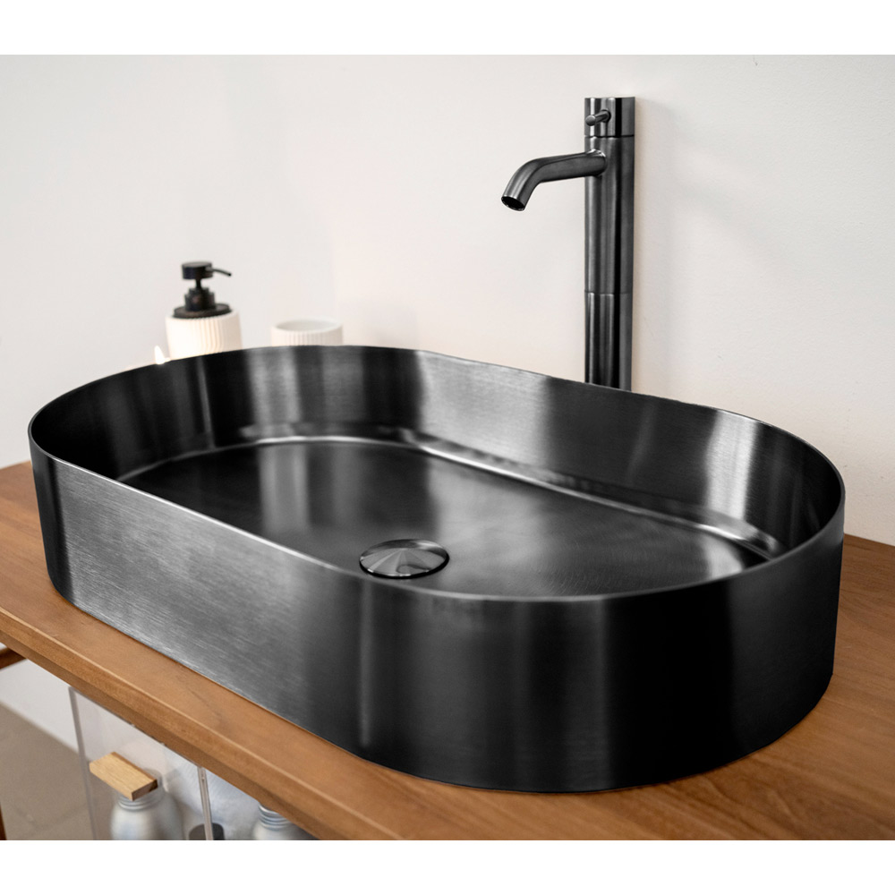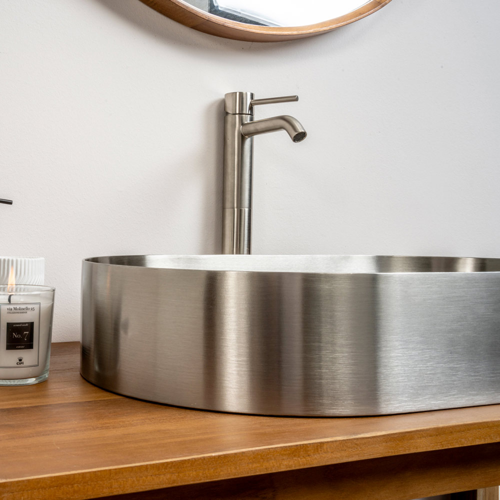 Il lavandino ovale da appoggio in acciaio inox SUS 304 da 3 mm è un gioiello di design e funzionalità. Prodotto da una sola lastra di metallo, offre un'estetica pulita e moderna. Il trattamento di finitura PVD+Nano coating, combinato con una spazzolatura meticolosa, conferisce un aspetto accattivante e quasi enigmatico all'oggetto, esaltando la lucentezza e la resistenza alle macchie e ai graffi. Il design è caratterizzato da forme equilibrate e proporzioni ideali, disponibile in tre finiture che si adattano con eleganza a qualsiasi ambiente. Inoltre, dettagli raffinati come il copripiletta coordinato incluso e l'assenza totale di saldature visibili, elevano questo lavandino a un vero capolavoro di artigianato e design, rendendolo un pezzo di spicco per bagni dal sapore lussuoso e contemporaneo.