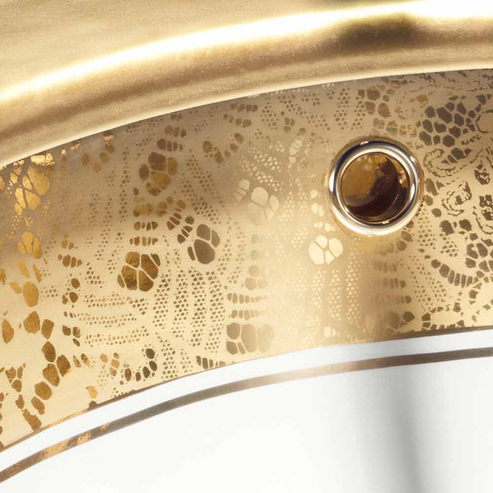 Lavabo da bagno ad incasso realizzato in Italia in fire clay lavorato a mano con banda decorata e filetto oro 24 carati.