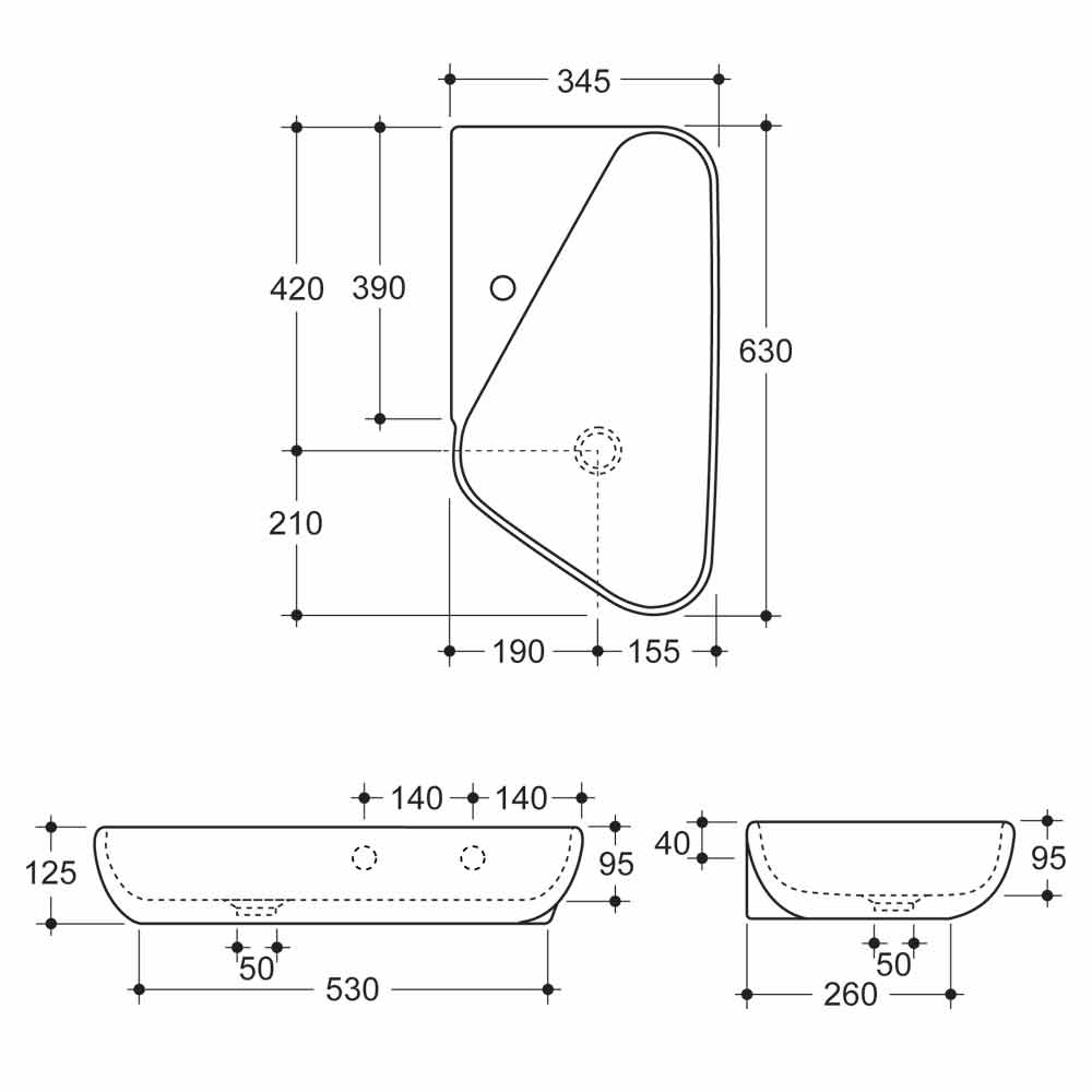 Lavamani di design dal bacino triangolare, dotato di mensola per alloggiamento rubinetto e sapone.