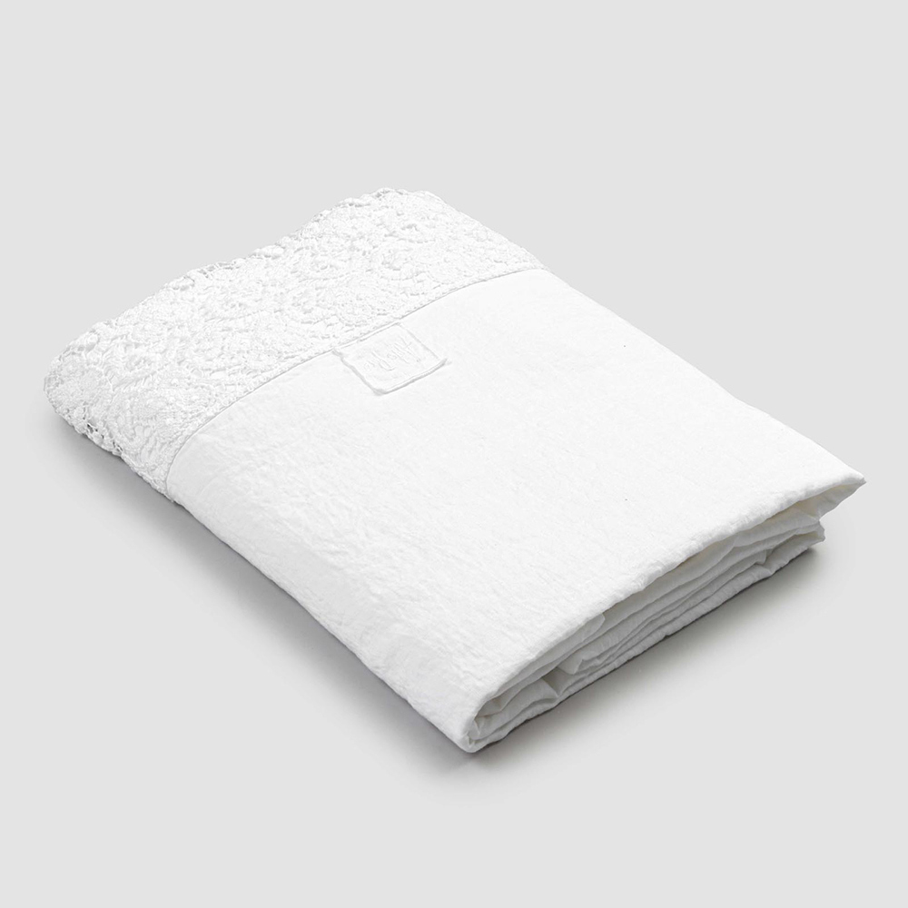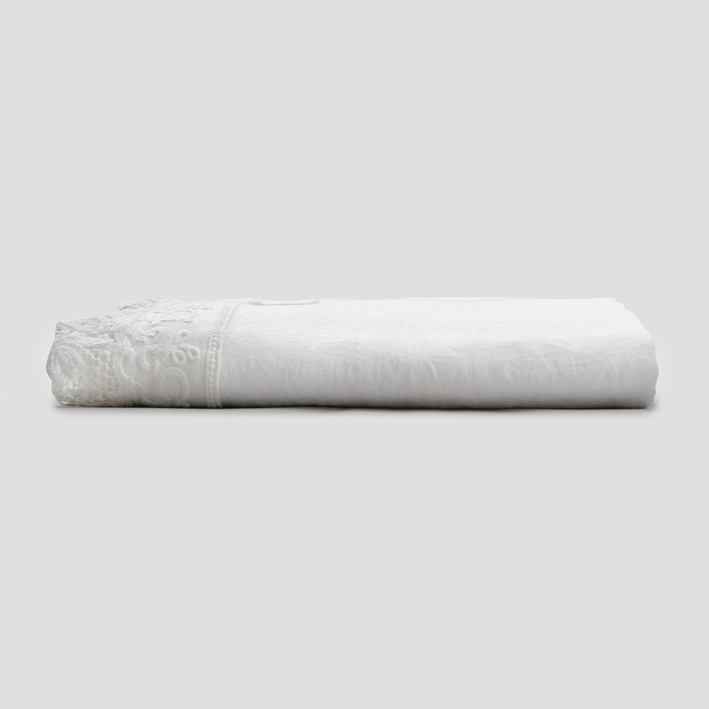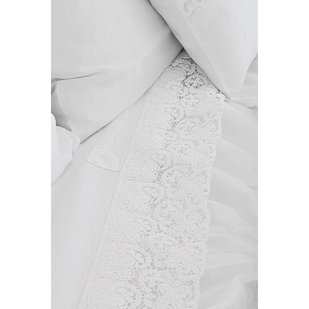 Lenzuolo per letto matrimoniale in puro lino bianco con varie tipologie di pizzo, design di lusso artigianale made in Italy.