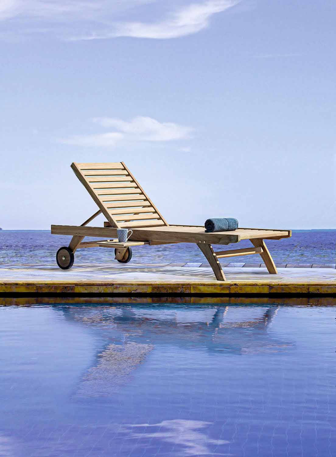 Lettino da esterno di design con ruote, reclinabile e vano portaoggetti in legno teak.