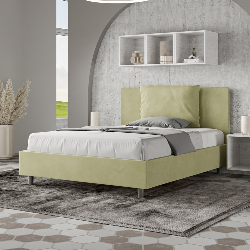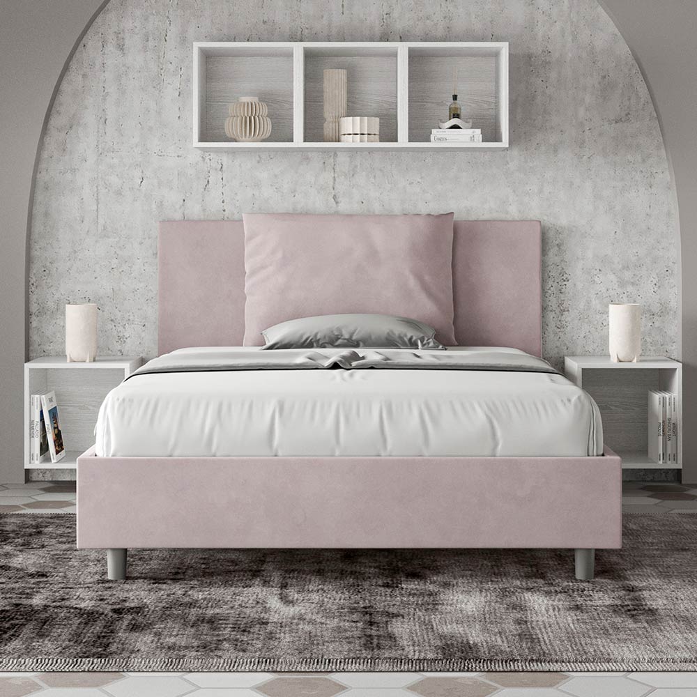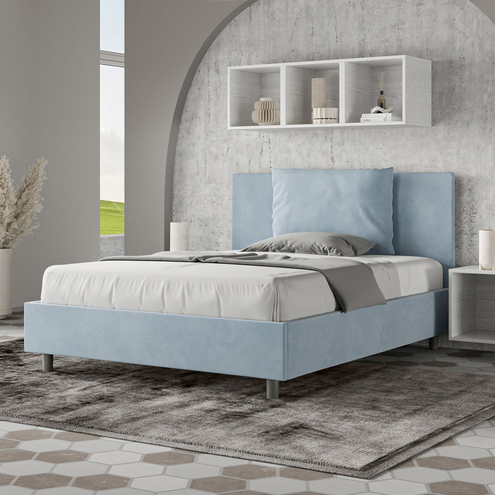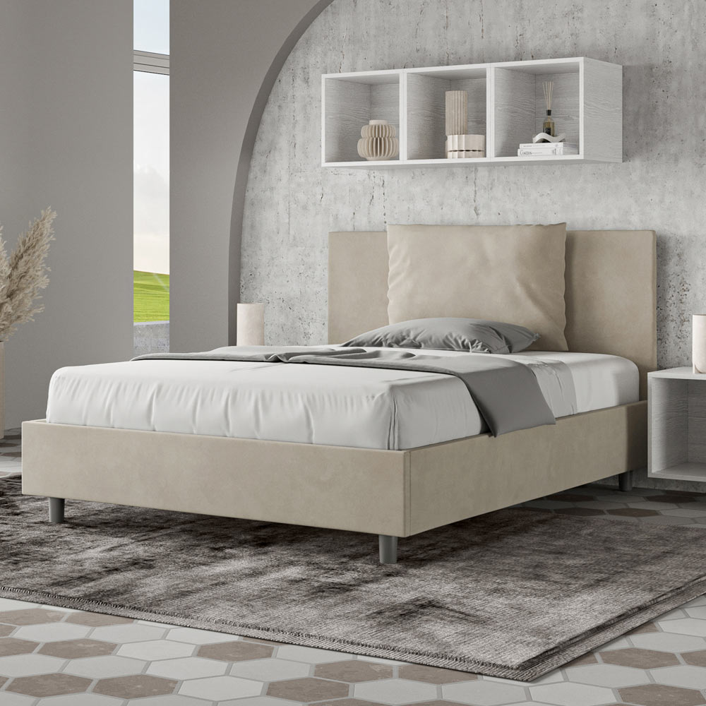 Letto alla francese 140x200 cm imbottito realizzato in pannelli di nobilitato e rivestito in microfibra, interamente Made in Italy.