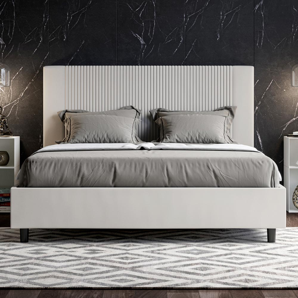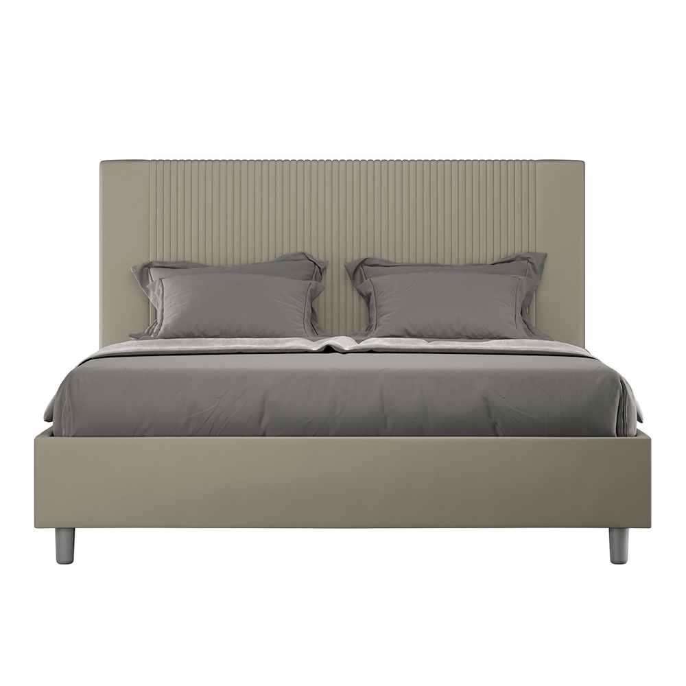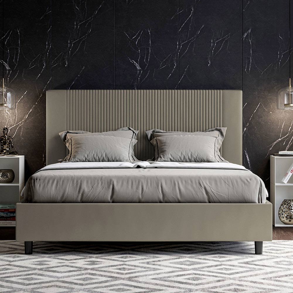 Questo letto matrimoniale, con il suo giroletto imbottito, è un prodotto di manifattura italiana realizzato in similpelle. Il suo design, sia semplice che moderno, si adatta perfettamente a spazi che si distinguono per un'eleganza sofisticata. La caratteristica principale di questo modello è la sua testata, ornata con un motivo a linee verticali, ideale per chi desidera abbinarlo ad ambienti di grande impatto visivo, con pareti di rilievo, mantenendo sempre un'eleganza inconfondibile.