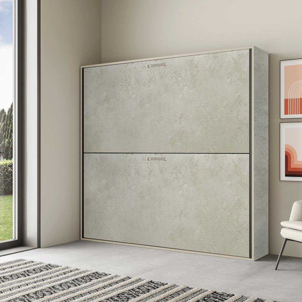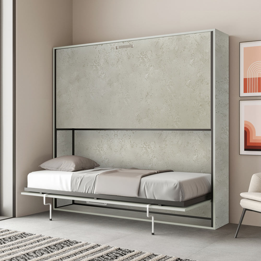 Letto a scomparsa orizzontale realizzato con struttura in pannelli di particelle di legno nobilitato sp.18 mm, struttura della rete in ferro rinforzato verniciato a polvere epossidica colore alluminio goffrato.