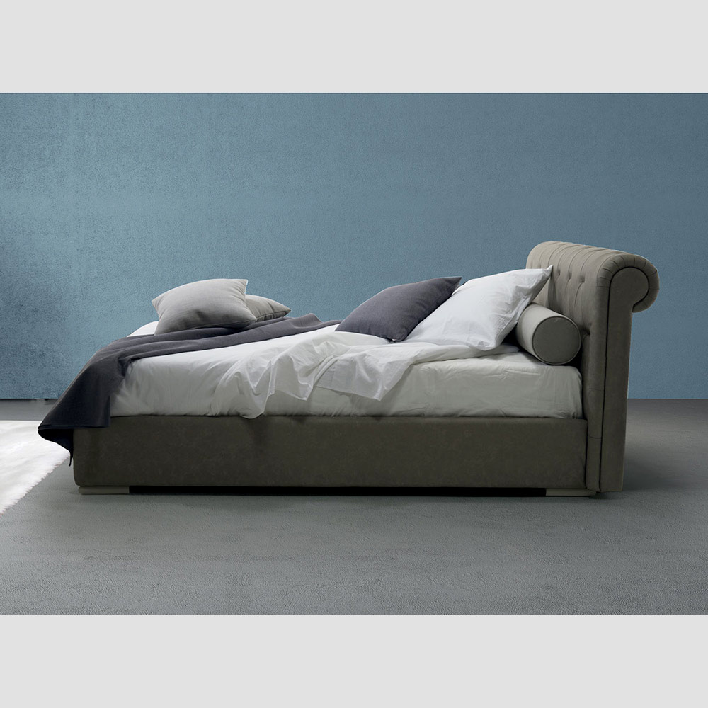 Letto imbottito matrimoniale di lusso in tessuto o ecopelle, realizzato artigianalmente in Italia con box contenitore.