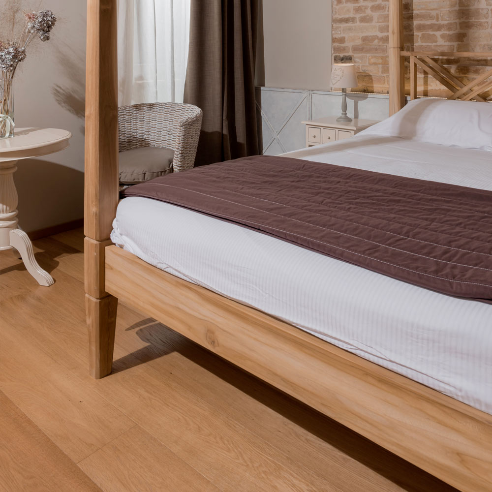 Il letto è realizzato con lavorazione artigianale e in legno essiccato naturalmente, materiale vivo che nel tempo può subire movimenti naturali. Eventuali filature o piccole crepe sono da considerarsi caratteristiche proprie del legno e possono comparire anche a distanza di tempo.