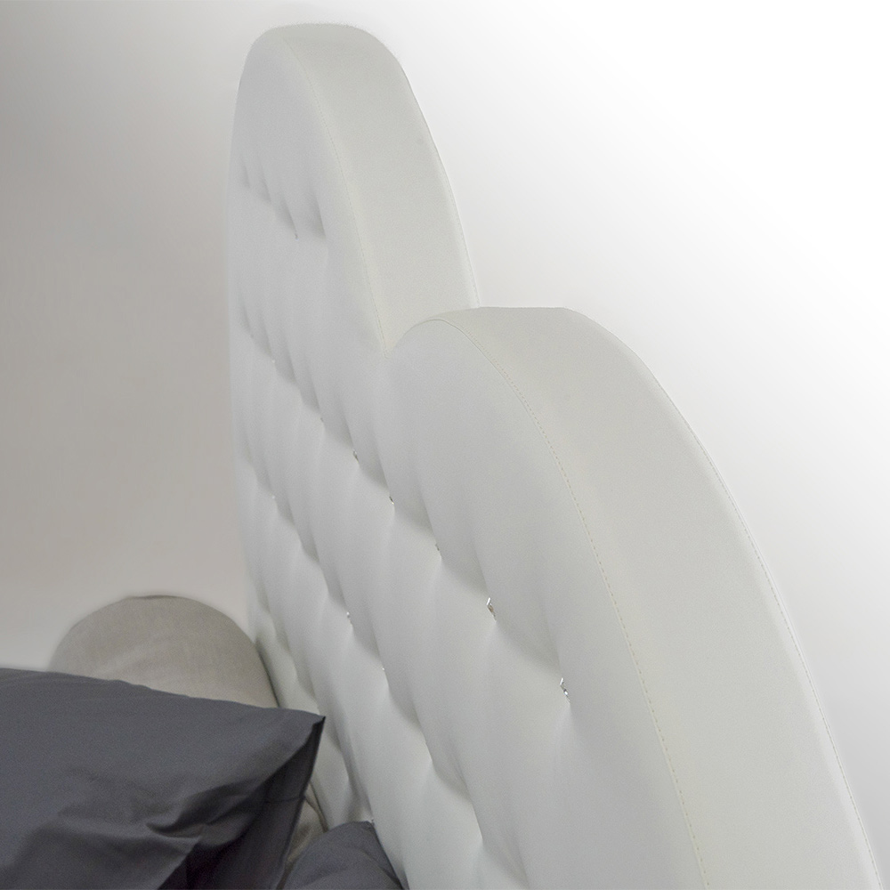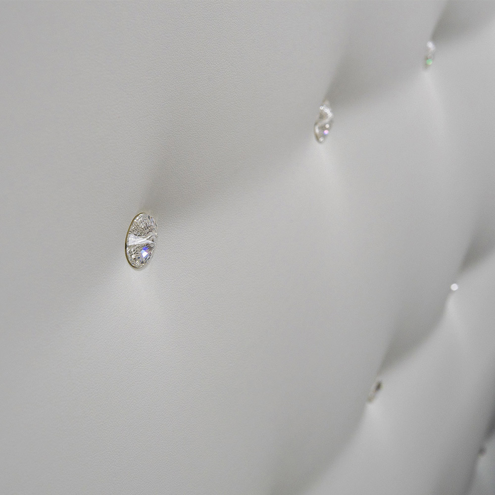 Letto matrimoniale di alta qualità con cassettone e testata imbottita con Swarovki; realizzato in Italia artigianalmente in tessuto o ecopelle.