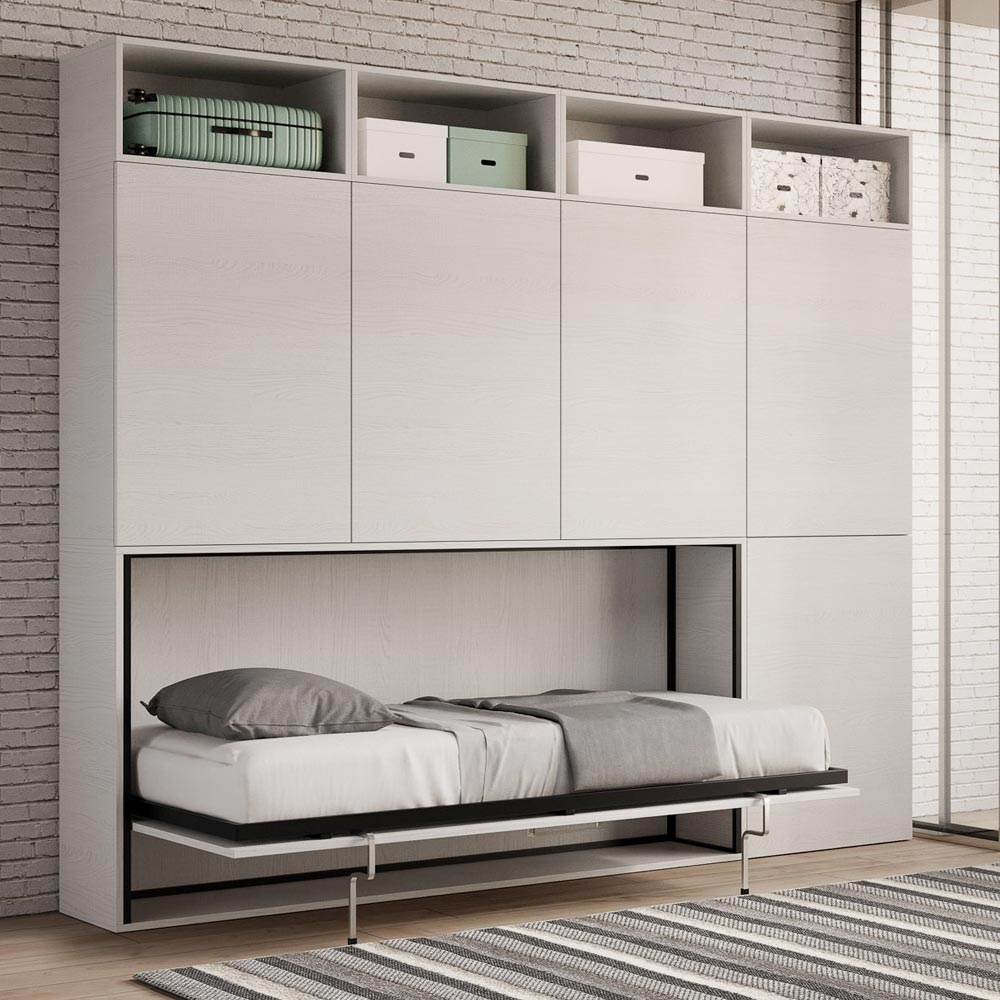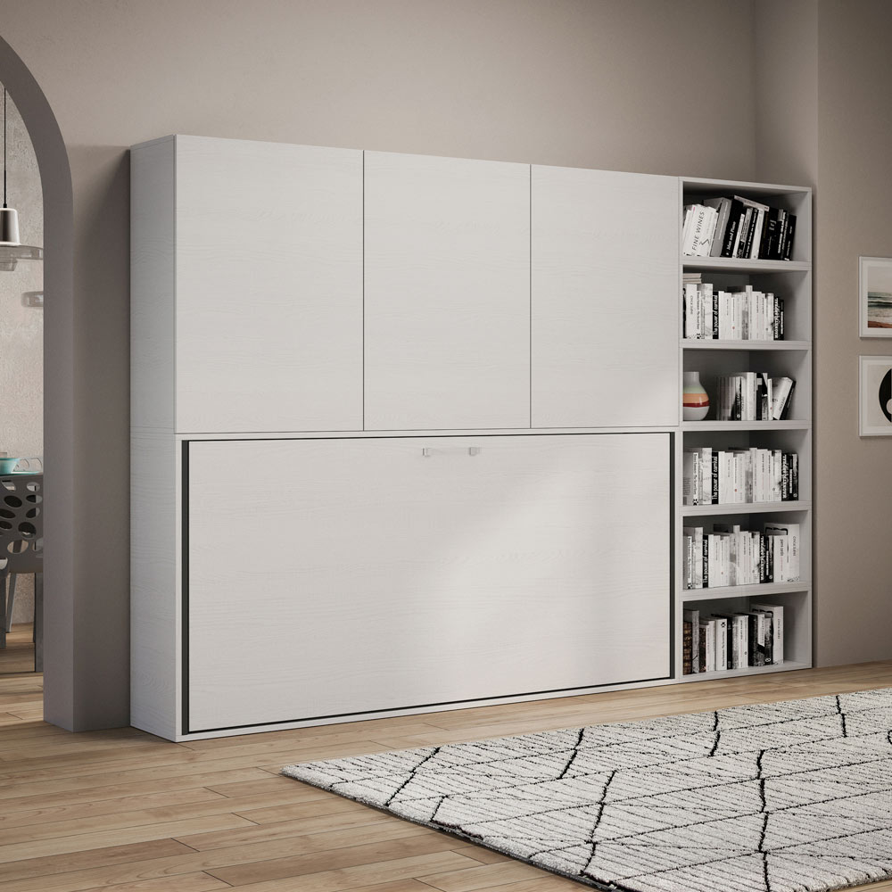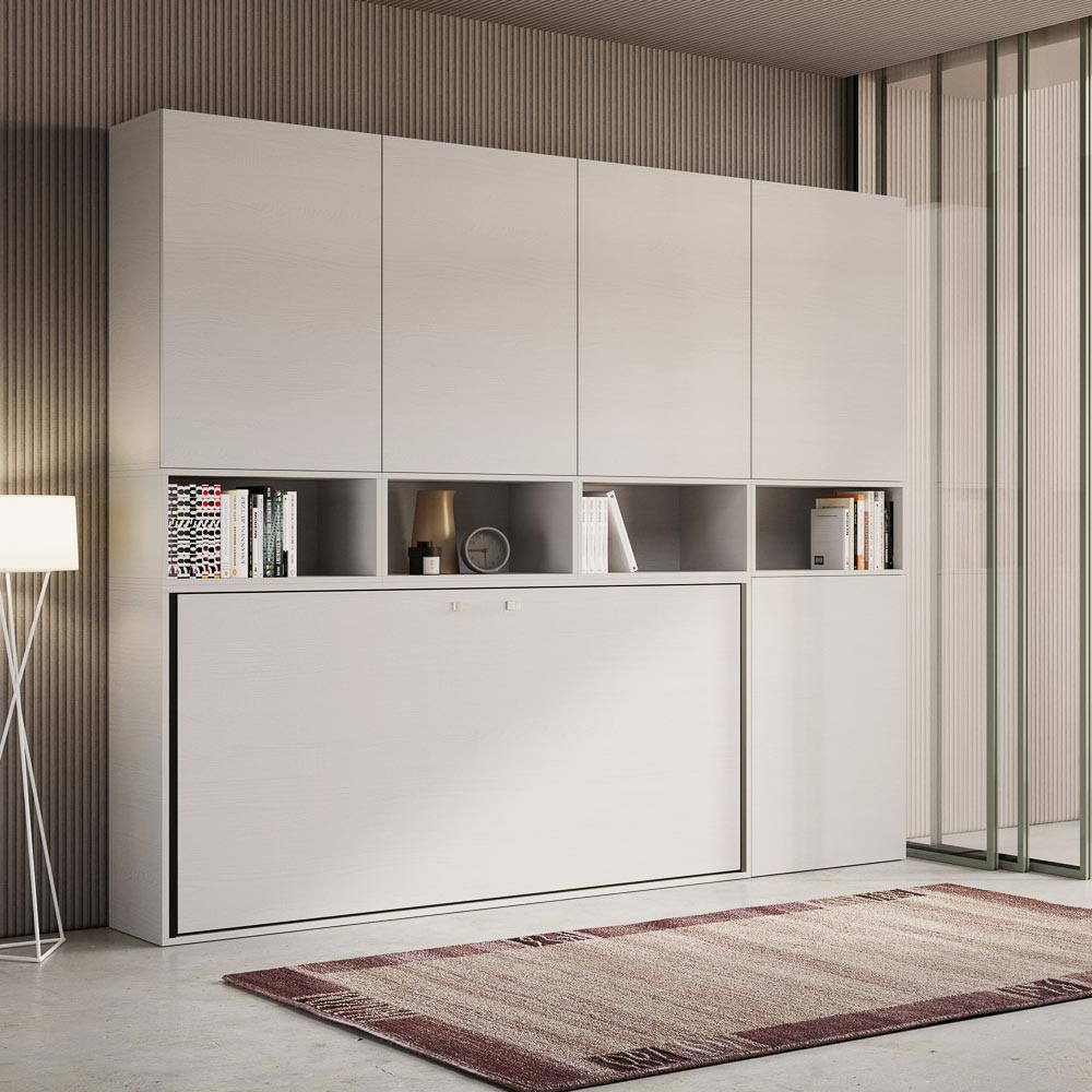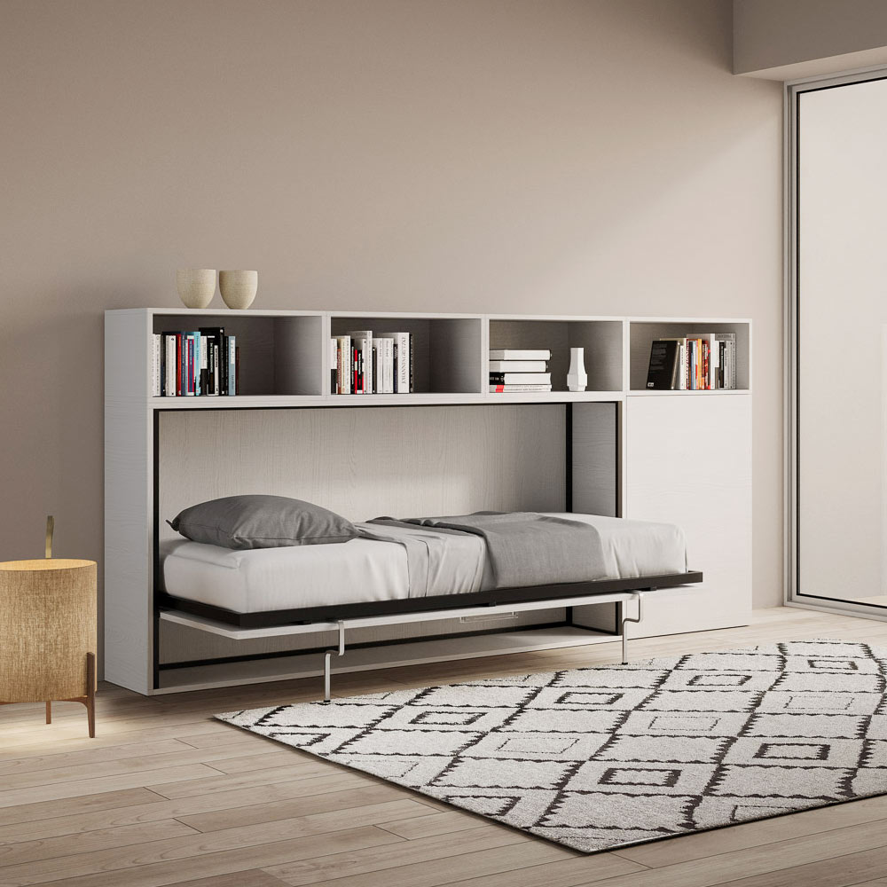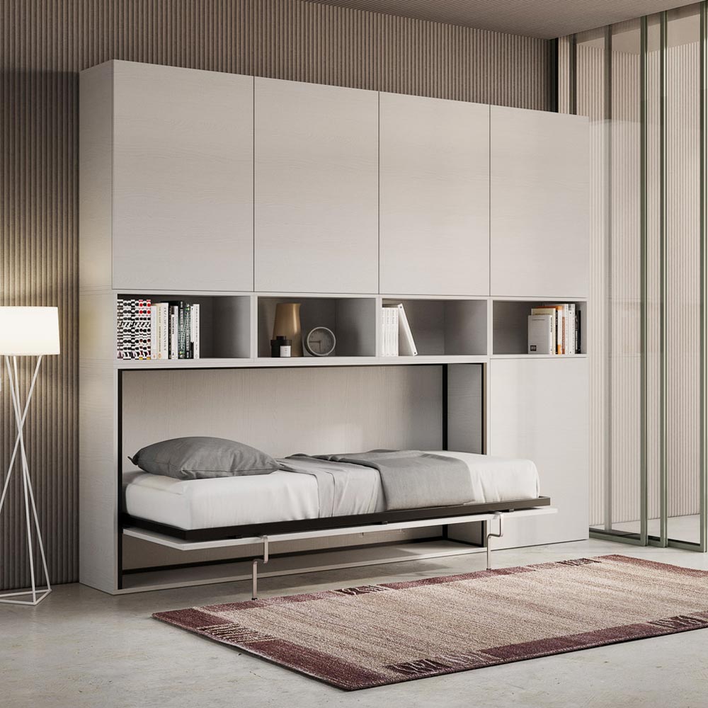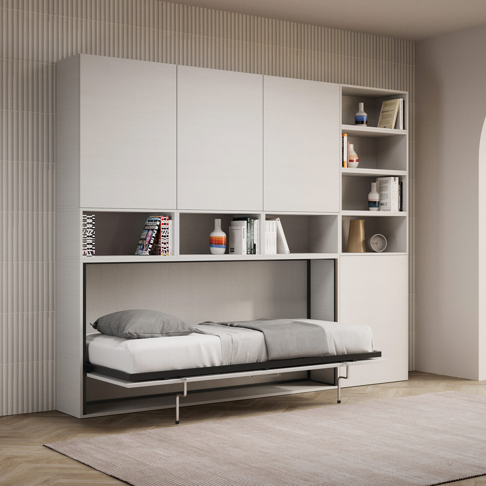 Letto singolo a scomparsa che si integra con una composizione di mobili Made in Italy