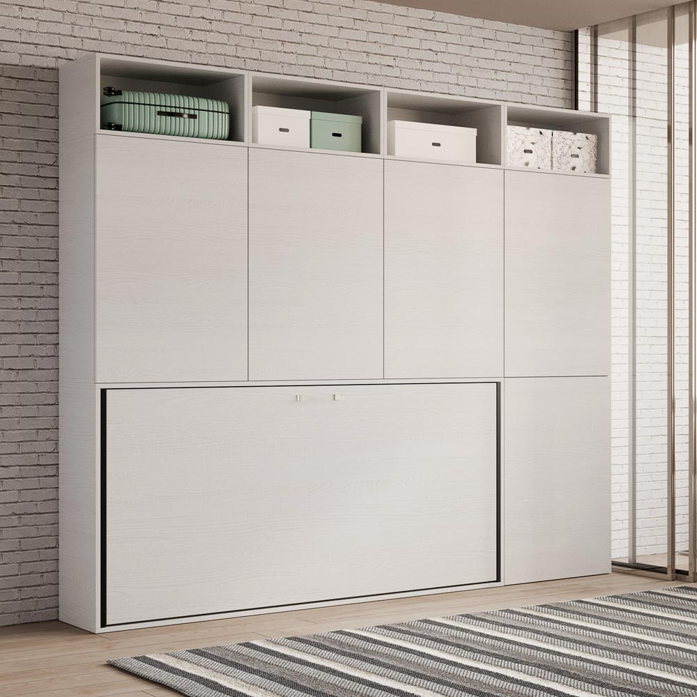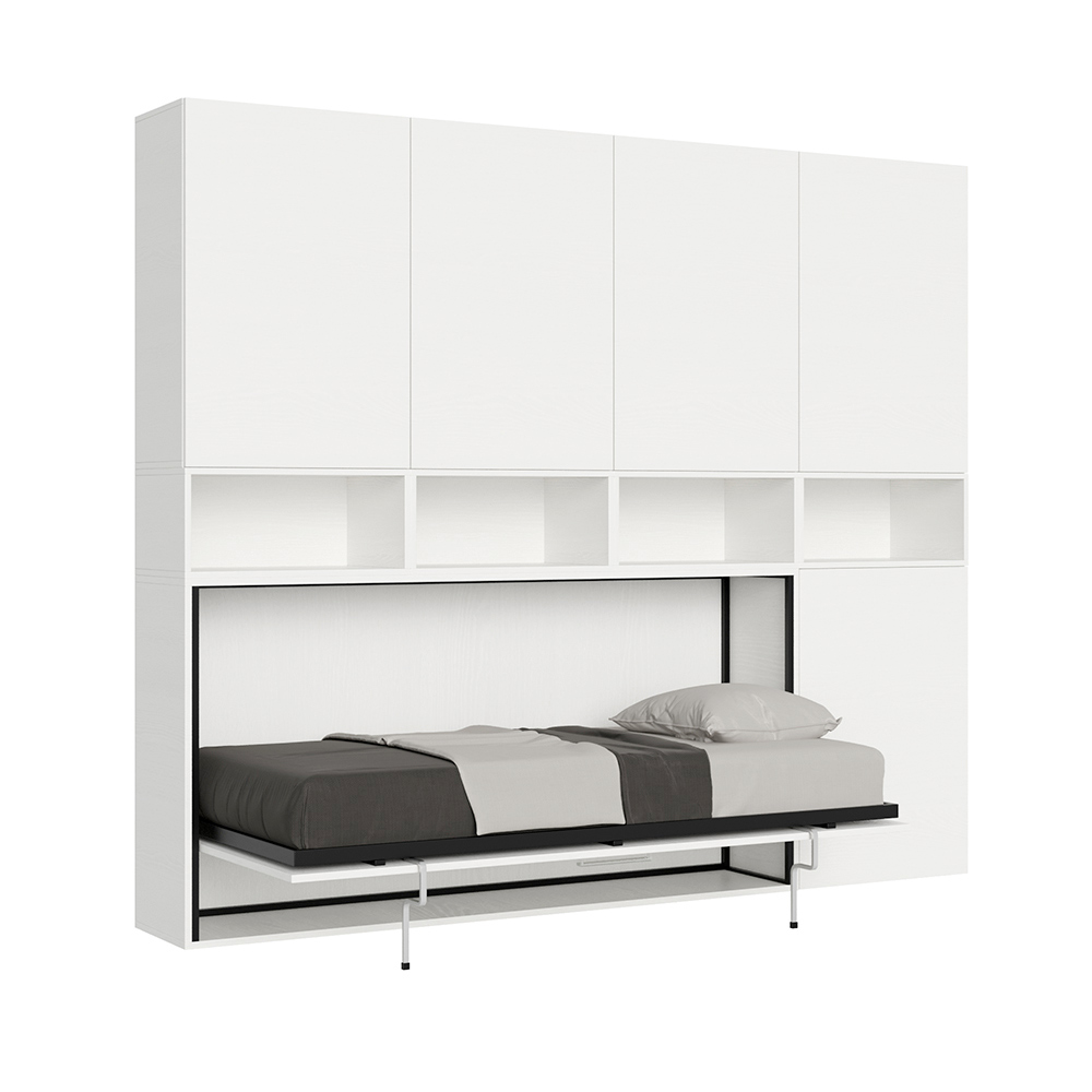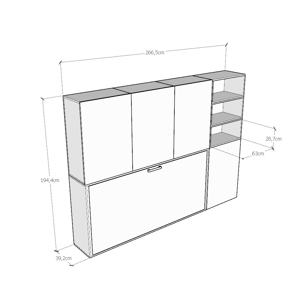 - COMPOSIZIONE A: un vano con anta e ripiano interno e quattro vani aperti - Letto chiuso a parete: 266,5 x 39,2 x altezza 129,7 cm / Letto aperto: 266,5 x 106 x altezza 129,7 cm