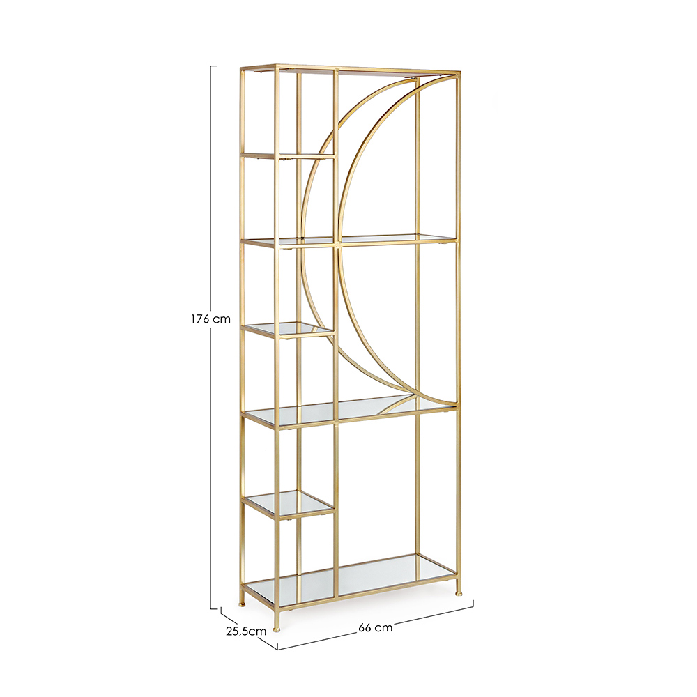 Libreria freestanding in acciaio e ripiani in vetro di design elegante.