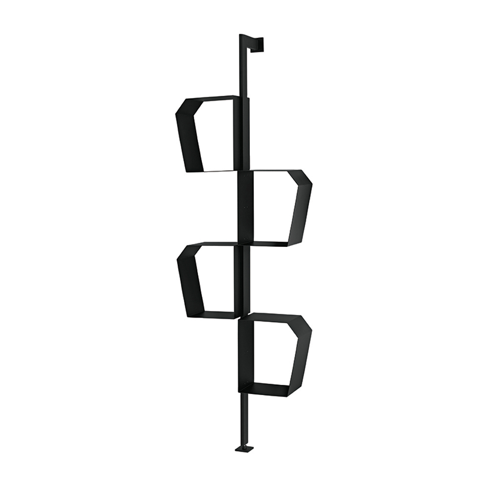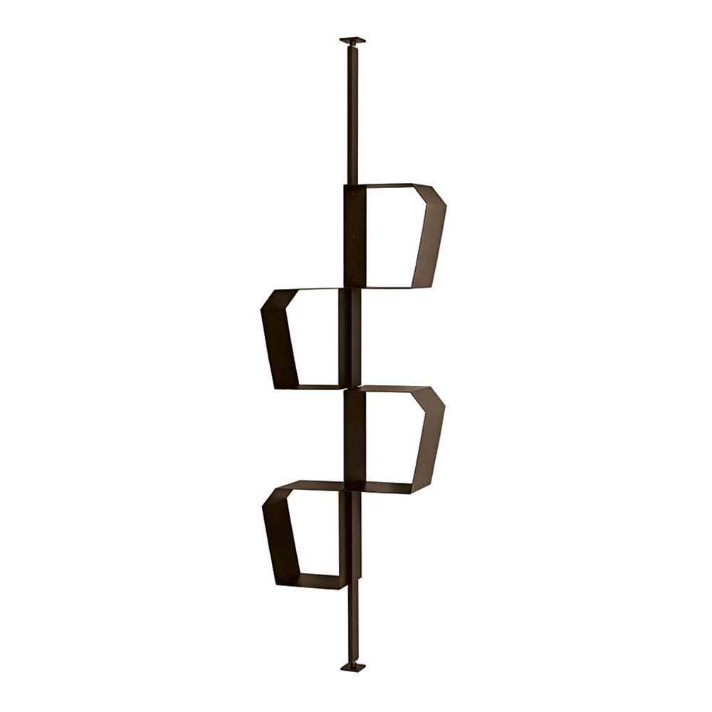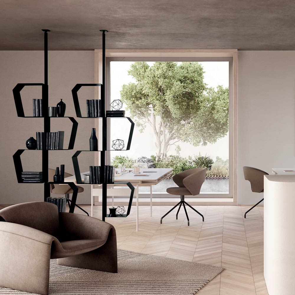 Grazie alla sua configurazione versatile, la libreria può essere installata con fissaggio a parete o a soffitto. Nella versione a soffitto può essere utilizzata anche come elemento divisorio, perfetto per separare gli spazi mantenendo leggerezza visiva.
