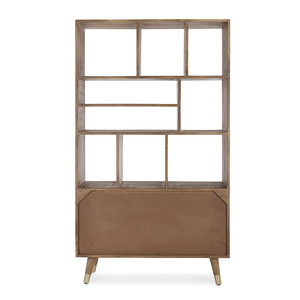 Libreria freestanding in legno di mango con ante riciclate e maniglie in acciao.