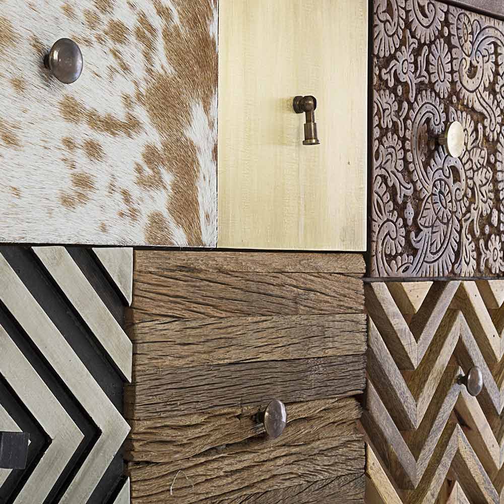 Il frontale delle ante è composto in legno riciclato di mango ed acacia con finitura con vernice a base d'acqua.