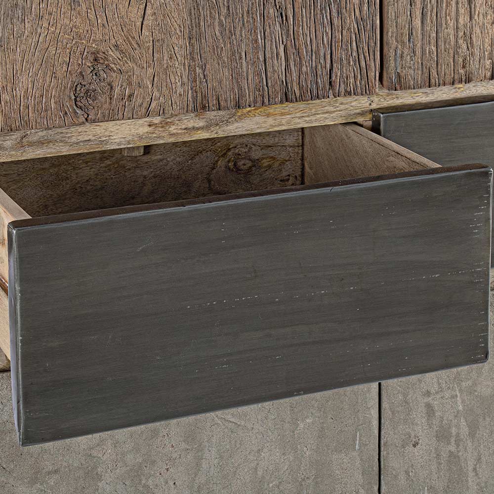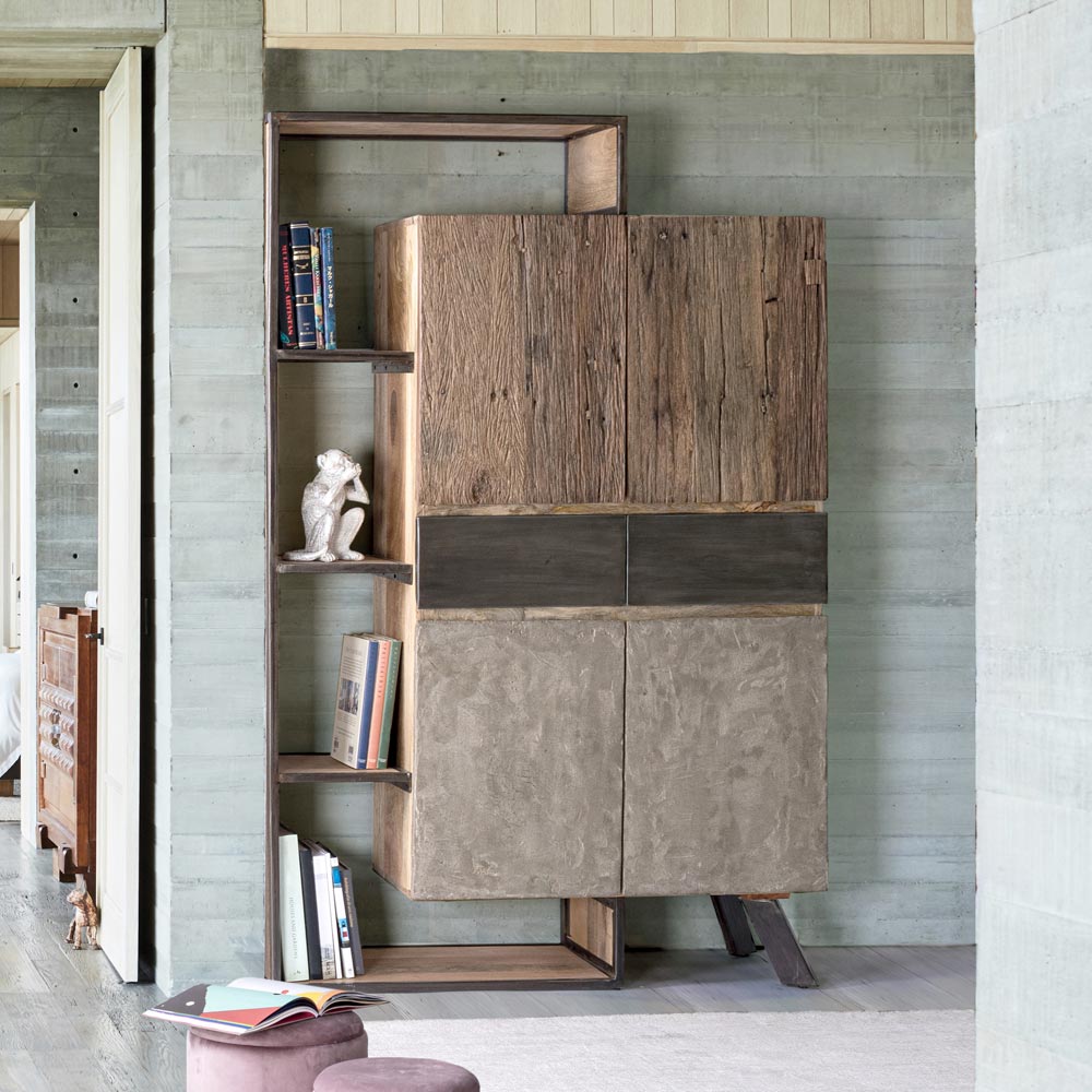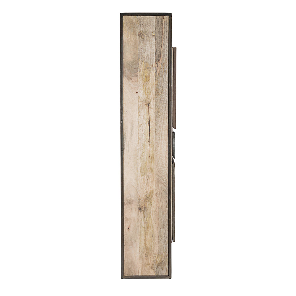 Le 4 ante e i 2 cassetti sono realizzati in legno riciclato, lamina di acciaio e finitura in fibra di cemento: la particolarità del mobile consiste proprio nella presenza di tasselli in legno di diverse specie e colore.