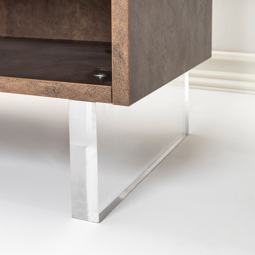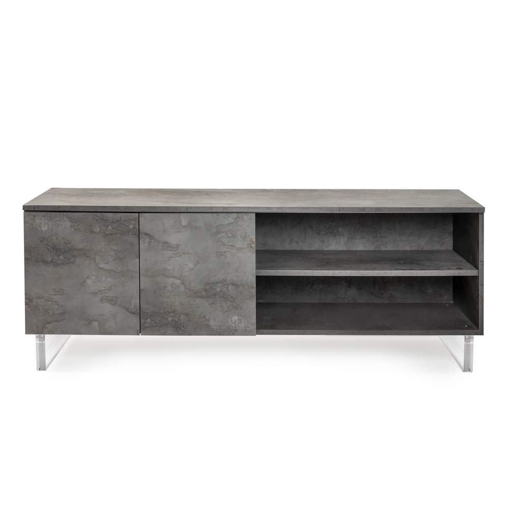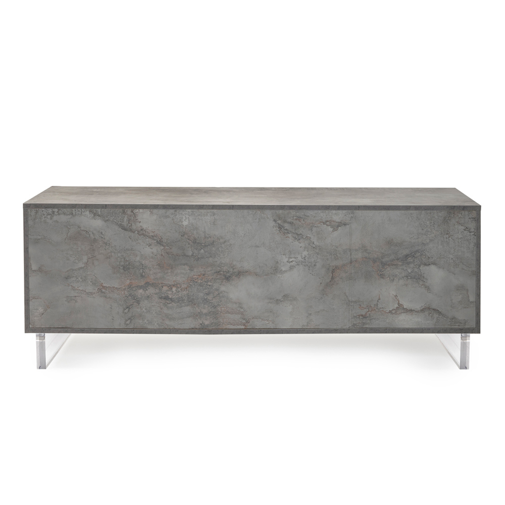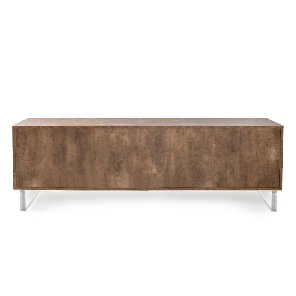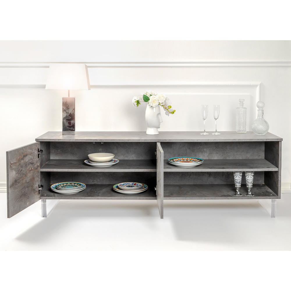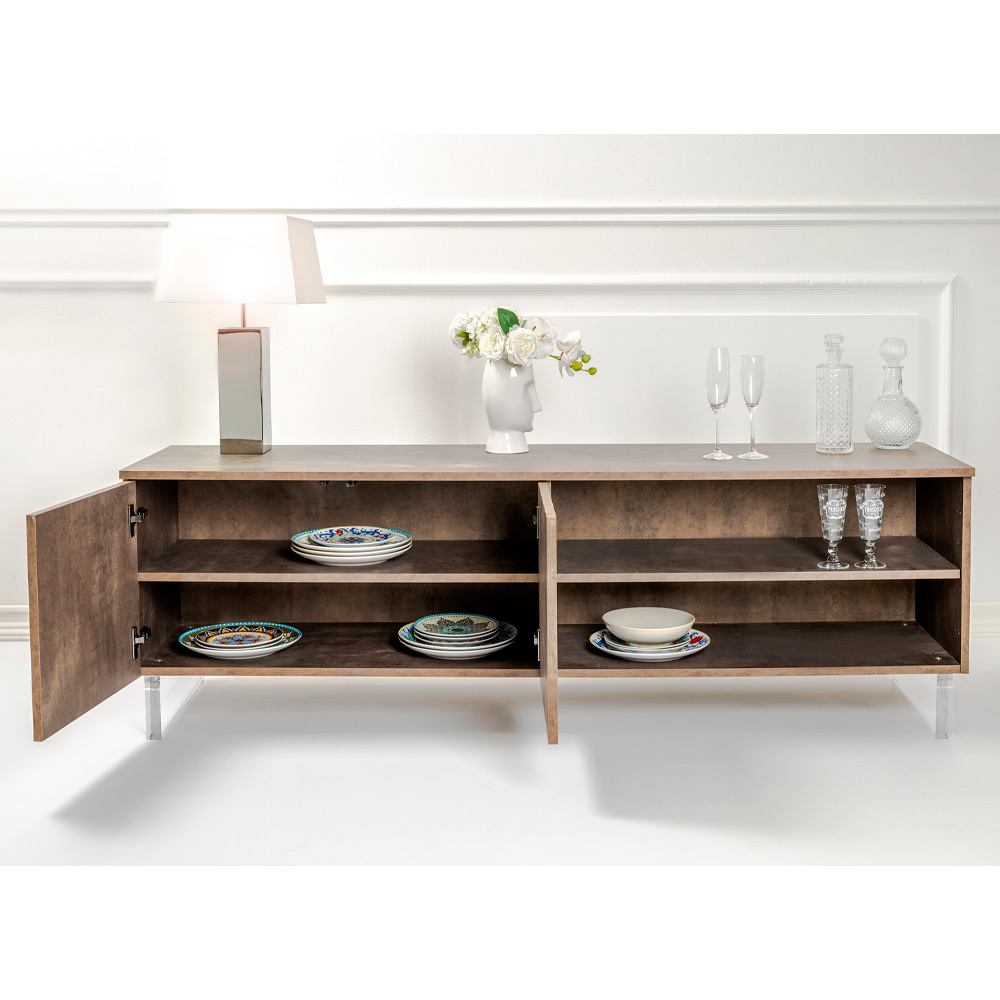 La madia, con i suoi piedi in plexiglass, sembra sfiorare il suolo, un dettaglio di design che aggiunge un tocco di modernità e leggerezza. All'interno, gli scaffali ordinati attendono di custodire tutto ciò che ami, dai libri agli oggetti di uso quotidiano, offrendo una soluzione elegante al bisogno di organizzazione.