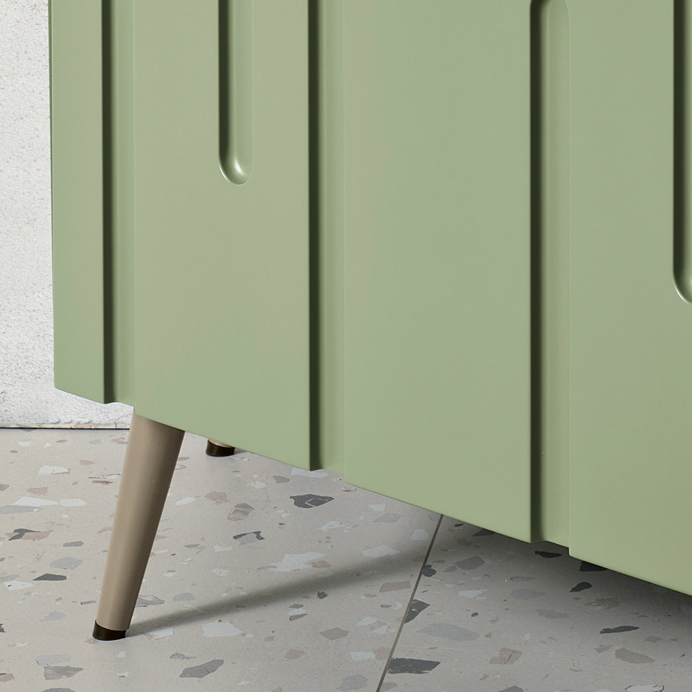 Le ante in MDF rivestito in PVC sono percorse da incisioni verticali irregolari che richiamano l’andamento naturale di stalattiti e stalagmiti, creando un raffinato effetto materico e dinamico. Questo gioco di rilievi dona profondità e movimento alla superficie, valorizzando la luce e rendendo la madia protagonista dello spazio.